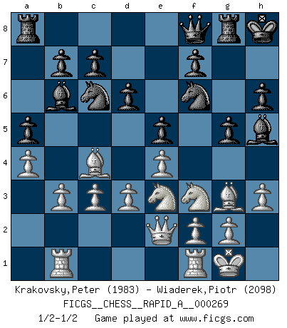Last move : 1/2-1/2 2021 June 6 10:1:40 [Event "FICGS__CHESS__RAPID_A__000269"] [Site "FICGS"] [Date "2021.05.13"] [Round "1"] [White "Krakovsky,Peter"] [Black "Wiaderek,Piotr"] [Result "1/2-1/2"] [WhiteElo "1983"] [BlackElo "2098"] 1.e4 e5 2.Nf3 Nc6 3.Bc4 Bc5 4.c3 Nf6 5.d3 a5 6.O-O d6 7.Bg5 h6 8.Bh4 O-O 9.a4 Ba7 10.Na3 Kh8 11.Nc2 Be6 12.b3 g5 13.Bg3 Bg4 14.h3 Bh5 15.Ne3 Rg8 16.Rb1 Qf8 17.Qe2 Bb6 1/2-1/2 Giuoco Piano Kingside Castling by player White (move 6) Kingside Castling by player Black (move 8) This chess game ended in a draw. Follow this game move after move (download)All that matters on the Chessboard is good moves. (Bobby Fischer) Schach ist das Spiel, das die Verrückten gesund hält. (Albert Einstein) Aquel que ve no otra dirección en el juego que la de dar Jaque Mate a su oponente, nunca será un buen jugador de Ajedrez. (Euwe) C'est une question de caractère, Beaucoup de gens perdent leur motivation très vite. D'autres, ils sont rares, peuvent la conserver très longtemps. J'aime les échecs, encore aujourd'hui je suis heureux d'analyser des parties. J'aime toujours gagner, je déteste encore perdre. Bien jouer est important pour mon intégrité intellectuelle et morale. Et puis les échecs vivent en ce moment une période historique grâce à Internet. Ils se développent dans les systèmes éducatifs à travers le monde. Ils sortent de leur ghetto, et c'est mon rôle de mener à bien cette révolution. (Gary Kasparov) Man with more than one clock never knows what time it is. (Chinese thought)