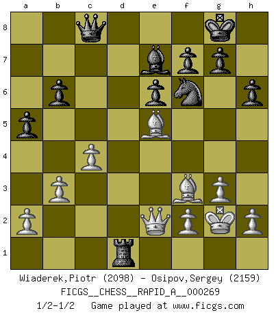 Last move : 1/2-1/2 2021 June 3 7:41:34 [Event "FICGS__CHESS__RAPID_A__000269"] [Site "FICGS"] [Date "2021.05.13"] [Round "1"] [White "Wiaderek,Piotr"] [Black "Osipov,Sergey"] [Result "1/2-1/2"] [WhiteElo "2098"] [BlackElo "2159"] 1.d4 Nf6 2.Nf3 e6 3.c4 b6 4.g3 Ba6 5.b3 Bb4+ 6.Bd2 Be7 7.Bg2 c6 8.Bc3 d5 9.Nbd2 Nbd7 10.O-O O-O 11.Re1 c5 12.e4 dxe4 13.Nxe4 Bb7 14.Nfg5 cxd4 15.Bxd4 Nxe4 16.Nxe4 Qc7 17.Qe2 Rad8 18.Rad1 h6 19.Bb2 Bxe4 20.Qxe4 a5 21.Qe2 Nf6 22.Be5 Qc8 23.Bf3 Rxd1 24.Rxd1 Rd8 25.Kg2 Rxd1 1/2-1/2 Queen's pawn game Kingside Castling by player White (move 10) Kingside Castling by player Black (move 10) This chess game ended in a draw. Follow this game move after move (download)I prefer to lose a really good game than to win a bad one. (David Levy) Ein Großmeister muß tausende Partien in seinem Kopf speichern, denn diese sind für Ihn, was die Worte der Muttersprache für gewöhnliche Leute sind, oder Noten für Musiker... (Garry Kasparov) Las combinaciones han sido siempre el aspecto más intrigante del Ajedrez. Los Maestros las buscan, el público las aplauden, los críticos las alaban. La razón se debe a que las combinaciones hacen posible que el Ajedrez sea más que un ejercicio matemático con una carencia de vida. Ellas son la poesía del juego, son del Ajedrez lo que la melodía es de la música. Ellas representan el triunfo de la mente sobre la materia. (Reuben Fine) Fischer est le meilleur joueur du monde et Karpov n'est qu'un joueur de bistrot. (Garry Kasparov, agé de 16 ans) Looking at the proliferation of personal web pages on the Net, it looks like very soon everyone on Earth will have 15 megabytes of fame. (M.G. Sriram)