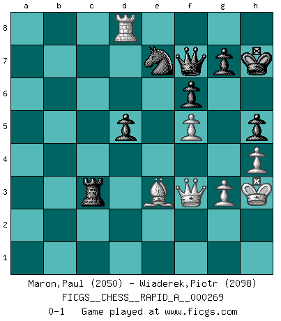 Last move : 0-1 2021 August 17 17:16:1 [Event "FICGS__CHESS__RAPID_A__000269"] [Site "FICGS"] [Date "2021.05.13"] [Round "1"] [White "Maron,Paul"] [Black "Wiaderek,Piotr"] [Result "0-1"] [WhiteElo "2050"] [BlackElo "2098"] 1.e4 e5 2.Nf3 Nc6 3.Nc3 Nf6 4.d4 exd4 5.Nxd4 Bb4 6.Nxc6 bxc6 7.Bd3 d5 8.exd5 O-O 9.O-O cxd5 10.Bg5 Be6 11.Ne2 h6 12.Bh4 Bd6 13.Nd4 Bd7 14.Bf5 Be5 15.Bxd7 Qxd7 16.f4 Bxd4+ 17.Qxd4 c5 18.Qxc5 Rac8 19.Qd4 Rc4 20.Qd3 Ne4 21.Bf2 Rb8 22.b3 Rc3 23.Qe2 Qc7 24.Rac1 Rc8 25.Bd4 Rxc2 26.Rxc2 Qxc2 27.Qg4 f6 28.h4 Rf8 29.Kh2 Kh8 30.Ra1 a6 31.Qd1 Qc8 32.Rc1 Qf5 33.g3 Kh7 34.Kg2 Re8 35.Qc2 h5 36.Qd3 Nd6 37.Rd1 Ne4 38.Rc1 Kh6 39.Rc6 Qg4 40.Rc7 a5 41.Ra7 a4 42.bxa4 Rc8 43.Ra5 Qd7 44.f5 Kh7 45.Qf3 Rc2+ 46.Kh3 Qe8 47.Ra6 Rd2 48.Be3 Rxa2 49.Re6 Qf7 50.Ra6 Ra3 51.Rb6 Nc5 52.Rc6 Nd7 53.Qe2 Ne5 54.Rc8 Rxa4 55.Qb5 Rc4 56.Rd8 Nc6 57.Rd6 Rc3 58.Qe2 Ne7 59.Qf2 Rc6 60.Rd8 Rc4 61.Qf3 Rc3 0-1 Four knights : Scotch, 4...exd4 Kingside Castling by player Black (move 8) Kingside Castling by player White (move 9) Player Black won this chess game. Follow this game move after move (download)If your opponent cannot do anything active, then don't rush the position; instead you should let him sit there, suffer, and beg you for a draw. (Jeremy Silman) Obwohl ich alt bin, darf mir niemand den Finger in den Mund stecken, sonst beisse ich. (Wilhelm Steinitz) Nunca antes ha habido un jugador de Ajedrez con tal conocimiento a fondo de las complejidades del juego y una inmensa voluntad absolutamente indomable de ganar. Yo pienso que Fischer es el jugador mas grande que jamás haya existido. (Lisa Lane) J'apprécie les joueurs d'est-indienne, c'est grâce à eux que je nourris ma famille depuis tant d'années. (Petrosian) It is not titles that honor men, but men that honor titles. (Niccolo Machiavelli)