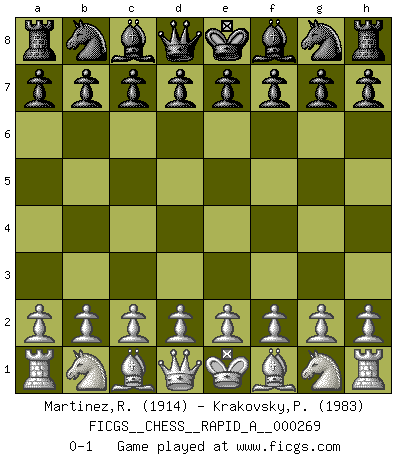 Last move : 0-1 2021 June 12 19:25:14 [Event "FICGS__CHESS__RAPID_A__000269"] [Site "FICGS"] [Date "2021.05.13"] [Round "1"] [White "Martinez,Rogelio"] [Black "Krakovsky,Peter"] [Result "0-1"] [WhiteElo "1914"] [BlackElo "1983"] 0-1 This chess game has been lost on time (started : 2021.05.13 8:33:11) Player Black won this chess game. Follow this game move after move (download)All Chess players should have a hobby. (Savielly Tartakower) Wenn Du einsam bist, wenn Du Dich in der Welt wie ein Fremder fühlst, spiele Schach. Das wird Deinen Geist erheben und Dein Ratgeber im Kampf sein. (Aristoteles) Por tratar de evitar la pérdida de una pieza, muchas personas han perdido una partida de Ajedrez. (Savielly Tartakover) Votre seul travail dans les ouvertures est d'obtenir un milieu de partie jouable. (Lajos Portish) The absolute truth is the thing that makes people laugh. (Carl Reiner)