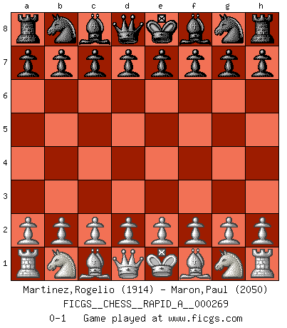 Last move : 0-1 2021 June 12 19:25:14 [Event "FICGS__CHESS__RAPID_A__000269"] [Site "FICGS"] [Date "2021.05.13"] [Round "1"] [White "Martinez,Rogelio"] [Black "Maron,Paul"] [Result "0-1"] [WhiteElo "1914"] [BlackElo "2050"] 0-1 This chess game has been lost on time (started : 2021.05.13 8:33:11) Player Black won this chess game. Follow this game move after move (download)I love all positions. Give me a difficult positional game, I will play it. But totally won positions, I cannot stand them. (Hein Donner) Sehr viele beherrschen heutzutage das große Einmalseins des Schachspiels und kennen sogar dessen Logarithmentafeln auswendig - deshalb sollte man hin und wieder zu beweisen trachten, dass zwei mal zwei auch fünf sein kann. (Mikhail Nekhemyevich Tal) El Ajedrez es un regaderazo frío para la mente. (Sir John Simon) D'abord les bases : Jouez et étudiez, puis étudiez et jouez, ensuite jouez et étudiez, puis étudiez et jouez. Deuxièmement : Donnez toujours le meilleur de vous-même ! (Ken Smith) Memory is a complicated thing, a relative to truth, but not its twin. (Barbara Kingsolver, Animal Dreams)
