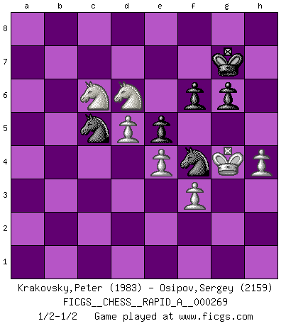 Last move : 1/2-1/2 2021 June 23 17:15:33 [Event "FICGS__CHESS__RAPID_A__000269"] [Site "FICGS"] [Date "2021.05.13"] [Round "1"] [White "Krakovsky,Peter"] [Black "Osipov,Sergey"] [Result "1/2-1/2"] [WhiteElo "1983"] [BlackElo "2159"] 1.e4 e5 2.Nf3 Nc6 3.Bc4 Nf6 4.d3 Bc5 5.c3 d6 6.O-O O-O 7.Re1 a5 8.Nbd2 Be6 9.Bb5 Qb8 10.Nf1 Qa7 11.Be3 Bxe3 12.Nxe3 Ne7 13.a4 h6 14.h3 Ng6 15.Bc4 Bxc4 16.Nxc4 Qa6 17.g3 Rfe8 18.Ne3 Qc6 19.Qb3 b6 20.Kg2 Qb7 21.Rad1 Rad8 22.c4 c6 23.c5 b5 24.cxd6 Rxd6 25.Nf5 Rd7 26.d4 Qa7 27.Qc3 Qc7 28.axb5 cxb5 29.Qxc7 Rxc7 30.Nd6 Re6 31.Nxb5 Rb7 32.Na3 Rb4 33.d5 Ra6 34.Nd2 Rxb2 35.Nac4 Rb4 36.Ra1 a4 37.f3 Nd7 38.Reb1 Rxb1 39.Nxb1 f6 40.Nb2 Nb6 41.Nc3 h5 42.Nbxa4 h4 43.Ra2 Nd7 44.Nb2 Rxa2 45.Nxa2 hxg3 46.Kxg3 Nc5 47.Nb4 Nf4 48.Nc4 Kf7 49.Ne3 g6 50.h4 Nd7 51.Nc6 Kg7 52.Kg4 Nc5 53.Nc4 Nd7 54.Nd6 Nc5 1/2-1/2 Two knights defense (Modern Bishop's Opening) Kingside Castling by player White (move 6) Kingside Castling by player Black (move 6) This chess game ended in a draw. Follow this game move after move (download)If cunning alone were needed to excel, women would be the best Chess players. (Albin) Das Schachspiel ist ein See, in welchem eine Mücke baden und ein Elefant ertrinken kann. (Emanuel Lasker) El ganar no lo es todo... pero el perder es nada. (Mednis) Le pion, dans sa simplicité, marche droit devant lui, mais lorsqu'il prend, il le fait obliquement? Ainsi l'homme, tant qu'il reste pauvre, marche dans la droiture et vit honnêtement, mais lorsqu'il recherche les honneurs, il flatte, se parjure et, par les voies obliques, cherche une position supérieure sur l'échiquier du monde. (Jean de Galles) Art disturbs, science reassures. (Georges Braque, Le Jour et la Nuit)