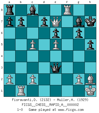 Last move : 1-0 2006 July 30 9:43:51 [Event "FICGS__CHESS__RAPID_A__000002"] [Site "FICGS"] [Date "2006.06.23"] [Round "1"] [White "Fioravanti,Diego"] [Black "Muller,Henri-Louis"] [Result "1-0"] [WhiteElo "2132"] [BlackElo "1929"] 1.e4 c5 2.f4 Nc6 3.Nc3 g6 4.Nf3 Bg7 5.Bb5 Nd4 6.O-O Nxb5 7.Nxb5 e6 8.Nd6 Kf8 9.d4 Qb6 10.e5 Nh6 11.Be3 Qxb2 12.dxc5 Qa3 13.Bf2 Qa4 14.Rb1 Ng4 15.Ng5 Qxf4 16.Bg3 Qxg5 17.Nxf7 Qe3+ 18.Kh1 Nxh2 19.Nxh8 Kg8 20.Bxh2 Kxh8 21.Qd6 h5 22.Rf8 Kh7 23.Qe7 1-0 Sicilian : Grand Prix attack Kingside Castling by player White (move 6) Player White won this chess game. Follow this game move after move (download)Chess makes man wiser and clear-sighted. (Vladimir Putin) Auf jeden Fall musst du zuerst Rechtsanwalt werden, damit du deine eigenen Interessen und die deiner Familie vertreten kannst. [Brief an seinen Sohn] (José Raúl Capablanca) El Ajedrez lo es todo: arte, ciencia y deporte. (Anatoly Karpov) Même si l'adversaire joue le coup analysé précédemment, recommencez l'analyse en voyant la nouvelle position. Première règle de Blumenfeld If you are going through hell, keep going. (Winston Churchill)