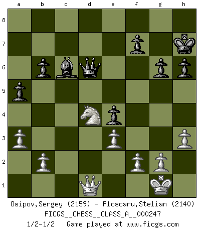 Last move : 1/2-1/2 2021 June 20 20:30:40 [Event "FICGS__CHESS__CLASS_A__000247"] [Site "FICGS"] [Date "2021.05.13"] [Round "1"] [White "Osipov,Sergey"] [Black "Ploscaru,Stelian"] [Result "1/2-1/2"] [WhiteElo "2159"] [BlackElo "2140"] 1.d4 d5 2.c4 e6 3.Nc3 Nf6 4.cxd5 exd5 5.Bg5 c6 6.e3 h6 7.Bh4 Be7 8.Bd3 O-O 9.Qc2 Re8 10.Nge2 Nbd7 11.O-O Ne4 12.Bxe7 Qxe7 13.Bxe4 dxe4 14.Rfd1 Nf6 15.h3 b6 16.d5 Nxd5 17.Nxd5 cxd5 18.Rxd5 Ba6 19.Nf4 Red8 20.Rad1 Bd3 21.Rxd8+ Rxd8 22.Qc3 Rd6 23.Rc1 Bb5 24.Nh5 Qg5 25.Qc8+ Kh7 26.Ng3 Qd5 27.Qg4 Rc6 28.Rxc6 Bxc6 29.a3 a5 30.Nf5 g6 31.Nd4 Qd6 32.Qd1 1/2-1/2 QGD : Exchange, positional line, 5...c6 Kingside Castling by player Black (move 8) Kingside Castling by player White (move 11) This chess game ended in a draw. Follow this game move after move (download)If Chess is a science, it's a most inexact one. If Chess is an art, it is too exacting to be seen as one. If Chess is a sport, it's too esoteric. If Chess is a game, it's too demanding to be just a game. If Chess is a mistress, she's a demanding one. If Chess is a passion, it's a rewarding one. If Chess is life, it's a sad one. (Unknown) Mutter, ich bin eben Ex-Weltmeister geworden. --beim nach Hause Kommen nach dem Verlust des WM-Titels an Mihail Botvinnik -- (Mikhail Nekhemyevich Tal) El Ajedrez es parte de la cultura, y si una cultura esta en decadencia, entonces también el Ajedrez declinará. (Mikhail Botvinnik) Une platitude souvent récitée à propos des Echecs est qu'une des choses les plus difficiles à réaliser est de gagner une position gagnante. Cela ne manque pas de sens mais, pour ma part, j'ai toujours trouvé plus difficile de gagner une position perdante. (Tim Krabbe) Wipe them out. All of them. (Darth Sidious in Star Wars ep.1)