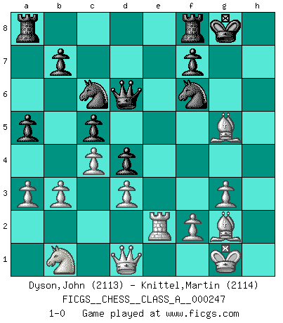 Last move : 1-0 2022 January 6 19:1:3 [Event "FICGS__CHESS__CLASS_A__000247"] [Site "FICGS"] [Date "2021.05.13"] [Round "1"] [White "Dyson,John"] [Black "Knittel,Martin"] [Result "1-0"] [WhiteElo "2113"] [BlackElo "2114"] 1.Nf3 d5 2.g3 Nf6 3.Bg2 c5 4.c4 d4 5.O-O Nc6 6.a3 a5 7.e3 e5 8.d3 h6 9.exd4 exd4 10.Re1+ Be7 11.Bf4 O-O 12.Ne5 Nb8 13.b3 Bd6 14.Ra2 g5 15.Bc1 Bxe5 16.Rxe5 Qd6 17.R5e2 Nc6 18.h4 Bg4 19.hxg5 Bxe2 20.Rxe2 hxg5 21.Bxg5 1-0 This chess game has been lost on time (started : 2021.05.13 11:54:26) Reti : King's Indian attack (Barcza system) Kingside Castling by player White (move 5) Kingside Castling by player Black (move 11) Player White won this chess game. Follow this game move after move (download)Any material change in a position must come about by mate, a capture, or a Pawn promotion. (Purdy) Ich würde die 30 stärksten Spieler der USA im Simultanspiel besiegen. (José Raúl Capablanca) Cuando tu no sabes absolutamente que mas hacer, es tiempo de entrar en pánico. (John van der Wiel) Les échecs c'est le défi de l'alpiniste, toujours plus haut, prêt à tout pour monter à l'assaut du Roi ennemi. Les échecs, c'est de la musique en mouvement, un ballet majestueux pour les yeux. C'est de la poésie composée par les fantômes du passé qui au même titre que Rimbaud ou Verlaine méritent notre admiration. Les échecs, c'est de la peinture ou le moindre mouvement modifie le tableau pour en faire un Picasso ou un Van Gogh. Les échecs, c'est tout et rien, c'est la vie et la mort. Jjulie33 sur le forum de France-Echecs. Political correctness is subjecting us to gross incompetence. (Johann Piek)