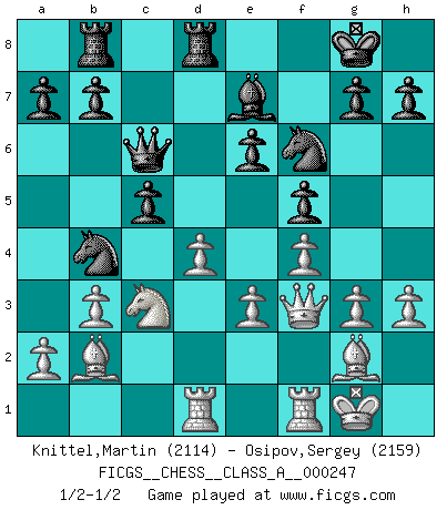 Last move : 1/2-1/2 2021 June 18 8:45:4 [Event "FICGS__CHESS__CLASS_A__000247"] [Site "FICGS"] [Date "2021.05.13"] [Round "1"] [White "Knittel,Martin"] [Black "Osipov,Sergey"] [Result "1/2-1/2"] [WhiteElo "2114"] [BlackElo "2159"] 1.Nf3 Nf6 2.c4 e6 3.g3 d5 4.Bg2 dxc4 5.Qa4+ Bd7 6.Qxc4 c5 7.Ne5 Qc8 8.Qd3 Nc6 9.Nxd7 Nxd7 10.b3 Be7 11.Bb2 O-O 12.Nc3 Nde5 13.Qe3 Qd7 14.f4 Ng4 15.Qf3 Rfd8 16.Rd1 f5 17.O-O Rab8 18.e3 Nb4 19.h3 Nf6 20.d4 Qc6 1/2-1/2 Reti Opening Kingside Castling by player Black (move 11) Kingside Castling by player White (move 17) This chess game ended in a draw. Follow this game move after move (download)Nonsense was the last thing Fischer was interested in, as far as Chess was concerned. (Elie Agur) Dein Körper muss in Topform sein. Dein Schach verfällt, wenn dein Körper verfällt. Der Körper kann nicht vom Geist getrennt werden. (Robert James Fischer) Un juego de Ajedrez es un dialogo, una conversación entre un jugador y su oponente. Cada movimiento del oponente puede contener amenazas o tropiezos, pero un jugador no se puede defender de las amenazas o tomar ventaja de los tropiezos si es que no se pregunta a sí mismo: ¿Que es lo que mi oponente va a hacer después de cada movida?. (Bruce A. Moon) C'est la seule position que je connaisse où les deux camps sont mals. Propos prêtés à V. Anand. 'preceded by its own quotation yields a falsehood' preceded by its own quotation yields a falsehood. (W. V. O. Quine - Set Theory And Its Logic, 1953)