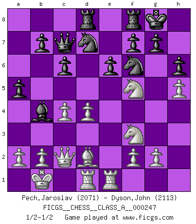 Last move : 1/2-1/2 2021 October 10 1:5:56 [Event "FICGS__CHESS__CLASS_A__000247"] [Site "FICGS"] [Date "2021.05.13"] [Round "1"] [White "Pech,Jaroslav"] [Black "Dyson,John"] [Result "1/2-1/2"] [WhiteElo "2071"] [BlackElo "2113"] 1.e4 c6 2.d4 d5 3.Nc3 dxe4 4.Nxe4 Bf5 5.Ng3 Bg6 6.h4 h6 7.Nf3 Nd7 8.h5 Bh7 9.Bd3 Bxd3 10.Qxd3 e6 11.Bf4 Qa5+ 12.Bd2 Bb4 13.c3 Be7 14.c4 Qc7 15.O-O-O Ngf6 16.Kb1 O-O 17.Rhe1 Rad8 18.Qc2 a5 19.Nf5 Bb4 1/2-1/2 Caro-Kann : Classical, 7...Nd7 Queenside Castling by player White (move 15) Kingside Castling by player Black (move 16) This chess game ended in a draw. Follow this game move after move (download)After black's reply to 1.e4 with 1..e5, leaves him always trying to get into the game. (Howard Staunton) Im Schach gibt es keinen Platz für Galanterie. (Irving Chernev) Aquellos que dicen entender al Ajedrez, no entienden nada. (Robert Hubner) La menace est plus forte que l'exécution. (Aaron Nimzovitch) Mandala - that's it! 16x16 squares as multiple of the four and the eight because of the Four Noble Truths and the Noble Eightfold Path. (Heinz-Georg Lehnhoff about Big Chess)