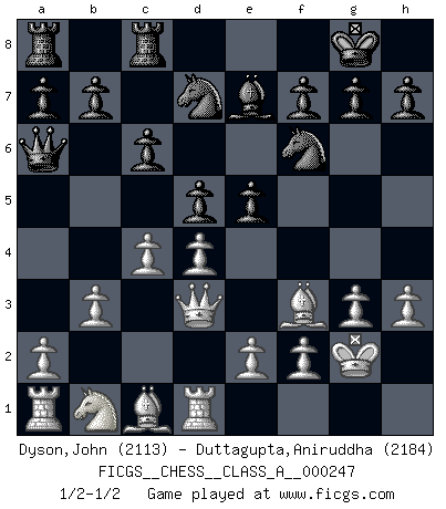 Last move : 1/2-1/2 2021 October 3 2:1:1 [Event "FICGS__CHESS__CLASS_A__000247"] [Site "FICGS"] [Date "2021.05.13"] [Round "1"] [White "Dyson,John"] [Black "Duttagupta,Aniruddha"] [Result "1/2-1/2"] [WhiteElo "2113"] [BlackElo "2184"] 1.Nf3 d5 2.g3 c6 3.Bg2 Bg4 4.c4 e6 5.O-O Nf6 6.Qb3 Qb6 7.h3 Bxf3 8.Bxf3 Be7 9.Rd1 Nbd7 10.d4 O-O 11.Kg2 Rfc8 12.Qd3 Qa6 13.b3 e5 1/2-1/2 Reti : King's Indian attack (Barcza system) Kingside Castling by player White (move 5) Kingside Castling by player Black (move 10) This chess game ended in a draw. Follow this game move after move (download)The chessboard is the world, the pieces are the phenomena of the Universe, the rules of the game are what we call the laws of Nature and the player on the other side is hidden from us. (Thomas Huxley) Es macht mich traurig, wenn ich sehe, dass Golfprofis mehr verdienen als Schachsportler. Obwohl ich davon überzeugt bin, dass wir Schachspieler viel härter trainieren müssen als die Golfer. (Alexandra Kosteniuk) Coloca el contenido del tablero de Ajedrez en un sombrero, agita las piezas vigorosamente, derrámalas en el tablero desde una altura de medio metro y así obtienes el estilo de Wilhelm Steinitz. (H. E. Bird) Il vaut mieux sacrifier les pièces de l'adversaire. (Xavier Tartacover) Follow your passion, and success will follow you. (Arthur Buddhold)