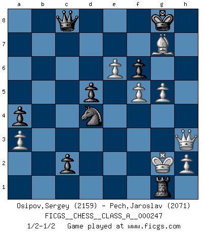 Last move : 1/2-1/2 2021 November 6 15:8:41 [Event "FICGS__CHESS__CLASS_A__000247"] [Site "FICGS"] [Date "2021.05.13"] [Round "1"] [White "Osipov,Sergey"] [Black "Pech,Jaroslav"] [Result "1/2-1/2"] [WhiteElo "2159"] [BlackElo "2071"] 1.d4 Nf6 2.c4 e6 3.Nc3 Bb4 4.f3 d5 5.a3 Bxc3+ 6.bxc3 c5 7.cxd5 exd5 8.e3 O-O 9.Bd3 b6 10.Ne2 Ba6 11.O-O Re8 12.Ng3 Bxd3 13.Qxd3 Nc6 14.Bb2 c4 15.Qd2 b5 16.Rae1 Re6 17.Bc1 a5 18.e4 b4 19.e5 bxc3 20.Qxc3 Ne8 21.f4 Re7 22.Kh1 Rb8 23.f5 f6 24.Nh5 Rb3 25.Qd2 Rf7 26.g4 h6 27.Qf2 a4 28.e6 Rfb7 29.Qg2 Rd3 30.Nxg7 Nxg7 31.Bxh6 c3 32.g5 Rd2 33.Re2 Rxe2 34.Qxe2 Nxd4 35.Qd3 c2 36.Bxg7 Qc8 37.Rc1 Rb1 38.Qh3 Rxc1+ 39.Kg2 Rg1+ 40.Kf2 Rf1+ 41.Kg2 Rg1+ 42.Kf2 Rf1+ 43.Kg2 Rg1+ 1/2-1/2 Nimzo-Indian : Kmoch variation Kingside Castling by player Black (move 8) Kingside Castling by player White (move 11) This chess game ended in a draw. Follow this game move after move (download)Of all my Russian books, the defense contains and diffuses the greatest 'warmth' which may seem odd seeing how supremely abstract Chess is supposed to be. (Vladimir Nabokov) Nur ein wirklich starker Spieler weiß wie schwach er spielt. (Savielly Grigorievitsch Tartakower) El Ajedrez es parte de la cultura, y si una cultura esta en decadencia, entonces también el Ajedrez declinará. (Mikhail Botvinnik) Les Echecs mettent en conflit, non pas deux intelligences, mais deux volontés. (Lasker) Work expands to fill the time available. (C. Northcote Parkinson, in Parkinson's Laws)