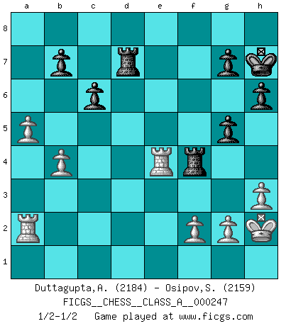 Last move : 1/2-1/2 2021 October 28 15:31:32 [Event "FICGS__CHESS__CLASS_A__000247"] [Site "FICGS"] [Date "2021.05.13"] [Round "1"] [White "Duttagupta,Aniruddha"] [Black "Osipov,Sergey"] [Result "1/2-1/2"] [WhiteElo "2184"] [BlackElo "2159"] 1.e4 e5 2.Nf3 Nc6 3.Bc4 Nf6 4.d3 Bc5 5.c3 d6 6.O-O O-O 7.Nbd2 a5 8.h3 Be6 9.Bb5 h6 10.Re1 Qb8 11.Nf1 Qa7 12.Be3 Bxe3 13.Nxe3 Ne7 14.a4 Ng6 15.d4 Nxe4 16.Bd3 Nf6 17.Bxg6 fxg6 18.dxe5 dxe5 19.Nxe5 g5 20.Nc2 Qc5 21.b4 Qd5 22.Nd4 Rfe8 23.Nb5 Qxd1 24.Raxd1 Rec8 25.Ng6 Kf7 26.Ra1 Kxg6 27.Rxe6 axb4 28.cxb4 c6 29.Nd6 Rc7 30.a5 Rd7 31.Kh2 Kh7 32.Ne4 Nxe4 33.Rxe4 Rf8 34.Ra2 Rf4 1/2-1/2 Two knights defense (Modern Bishop's Opening) Kingside Castling by player White (move 6) Kingside Castling by player Black (move 6) This chess game ended in a draw. Follow this game move after move (download)He who fears an isolated Queen's Pawn should give up Chess. (Siegbert Tarrasch) Ich organisiere ein großes Turnier, was mich etwa 120000 Dollar kostet. Ich denke, das ist das erste Mal in der Schachgeschichte, daß ein Schachgroßmeister auch als Mäzen auftritt. (Miguel Najdorf) El tablero es el mundo, las piezas es el fenomeno del universo, las reglas del juego son lo que llamamos leyes de la naturaleza y el jugador del lado opuesto, se encuentra oculto a nuestra vista. (Thomas Huxley) Les échecs sont un jeu terrible. Si vous n'avez pas le centre, votre adversaire a une position plus libre. Par contre, si vous avez le centre, alors vous avez vraiment quelque chose pour laquelle vous inquiéter ! (Siegbert Tarrasch) In theory there is no difference between theory and practice. In practice there is. (Yogi Berra)