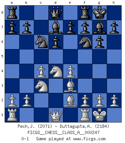 Last move : 0-1 2021 July 21 11:7:45 [Event "FICGS__CHESS__CLASS_A__000247"] [Site "FICGS"] [Date "2021.05.13"] [Round "1"] [White "Pech,Jaroslav"] [Black "Duttagupta,Aniruddha"] [Result "0-1"] [WhiteElo "2071"] [BlackElo "2184"] 1.e4 c5 2.Nf3 Nc6 3.d4 cxd4 4.Nxd4 g6 5.c4 Bg7 6.Be3 Nf6 7.Nc3 O-O 8.Be2 d6 9.O-O Bd7 0-1 This chess game has been lost on time (started : 2021.05.13 11:54:26) Sicilian : Accelerated Fianchetto, Maroczy bind, 6.Be3 Kingside Castling by player Black (move 7) Kingside Castling by player White (move 9) Player Black won this chess game. Follow this game move after move (download)The isolated Pawn casts gloom over the entire chessboard. (Aaron Nimzovich) Es gibt nur zwei wahre Schachgenies - das andere war Wilhelm Steinitz, der Weltmeister von 1872 bis 1894. (Robert James Fischer) No hay otro maestro que tenga una voluntad terrífica de ganar. Al tablero, el irradía peligro y aún los oponentes mas fuertes tienden a congelarse como liebres cuando olfatean a una pantera. Aún sus debilidades son peligrosas. Con las blancas, su juego de apertura es predecible - te es posible hacer planes en su contra - pero es tan fuerte que tus planes casi nunca funcionan. En el juego medio, su precisión e invención son fabulosas y en finales, tú simplemente no le puedes vencer. (Experto Alemán anónimo) Le plus grand jeu de l'esprit jamais inventé, plus vous l'apprenez, plus vous y prenez du plaisir. (Garry Kasparov) Rules and bones are meant to be broken. (Anonymous)