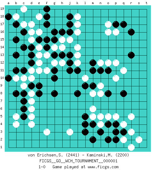 Last move : 1-0 2007 November 24 11:19:7 [Event "FICGS__GO__WCH_TOURNAMENT__000001"] [Site "FICGS"] [Date "2007.07.12"] [Round "1"] [Black "von Erichsen,Svante Carl"] [White "Kaminski,Marek"] [Result "1-0"] [Rating 1 "2441"] [Rating 2 "2200"] 1.r16 d4 2.c16 k17 3.q3 e16 4.d14 c17 5.b17 d17 6.b15 e14 7.d13 r5 8.q8 o5 9.n3 q11 10.r13 p12 11.o8 m5 12.l4 m8 13.o11 o12 14.n11 n12 15.m11 p16 16.p17 o17 17.q17 o16 18.m12 j3 19.l5 m6 20.p4 p5 21.c6 f3 22.k8 m3 23.m4 n4 24.o4 n5 25.l3 o3 26.m2 q4 27.p3 r3 28.r2 s2 29.d9 b4 30.j16 k16 31.g16 h15 32.g15 e13 33.g13 e12 34.d12 e11 35.o2 q2 36.p2 r1 37.g11 d11 38.c11 d15 39.c14 g14 40.f14 h14 41.f15 f13 42.e15 d16 43.h16 j15 44.f17 e18 45.f18 b18 46.a18 g12 47.h13 h12 48.j13 k14 49.j18 k18 50.j17 c19 51.f19 c10 52.b11 b10 53.b13 d10 54.g8 l10 55.j11 k12 56.m9 n9 57.l9 n8 58.j12 k13 59.k11 p10 60.c8 d8 61.e8 d7 62.e9 c9 63.c7 d6 64.c5 d5 65.b8 f11 66.g10 b5 67.a10 1-0 Here are the names of the openings (joseki) played in the four corners : Corner d16 : c16 e16 Komoku (Somok, Xiao~mu`) 3-4 Point. The komoku (3-4) point is the traditional corner enclosure move.. Ikken Takagakari (Hankan Nop'dakeolch'im, Yi Gaogua`jiao~, 1-Space High Approach). The 5-4 approach move has become more popular in modern times, as modern Go emphasizes speed and influence. Corner q4 : q3 r5 Komoku (Somok, Xiao~mu`) 3-4 Point. The komoku (3-4) point is the traditional corner enclosure move.. Ikken Kakari (Hankan Keolch'im, Yi Gua`jiao~, 1-Space Low Pincer). The small knight move is the basic approach move to the 3-4 point stone. It has been continually used for over four centuries. There are limitless variations, with new moves constantly being discovered. White 2 opens the door to a treaure store of joseki. Corner q16 : r16 q11 Komoku (Somok, Xiao~mu`) 3-4 Point. The komoku (3-4) point is the traditional corner enclosure move.. Player Black won this Go (weiqi, baduk) game. Follow this game move after move (download)If White takes all four corners, Black should resign; if Black takes all four corners, Black should also resign. (David Kent) For peace of mind, resign as general manager of the universe. (Douglas Adams)