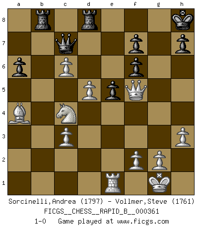 Last move : 1-0 2021 August 4 10:42:49 [Event "FICGS__CHESS__RAPID_B__000361"] [Site "FICGS"] [Date "2021.05.19"] [Round "1"] [White "Sorcinelli,Andrea"] [Black "Vollmer,Steve"] [Result "1-0"] [WhiteElo "1797"] [BlackElo "1761"] 1.e4 e5 2.Nf3 Nc6 3.Bb5 a6 4.Ba4 Nf6 5.O-O b5 6.Bb3 Be7 7.Re1 O-O 8.c3 d6 9.h3 Na5 10.Bc2 c5 11.d4 Nc6 12.d5 Nb8 13.a4 Bb7 14.Qe2 c4 15.Be3 Nbd7 16.Na3 bxa4 17.Nxc4 Qc7 18.Rxa4 Nc5 19.Ra5 Ncd7 20.Nfd2 Rfc8 21.b4 Bd8 22.Ra3 Be7 23.Qf3 Qd8 24.Na5 Qc7 25.Ba4 Nc5 26.bxc5 Qxa5 27.c6 Bxc6 28.dxc6 Rab8 29.Nc4 Qc7 30.Bg5 d5 31.exd5 Bxa3 32.Bxf6 gxf6 33.Nxa3 Rd8 34.Nc4 Kg7 35.Qg4+ Kh8 36.Qf5 1-0 Ruy Lopez : 5.O-O Kingside Castling by player White (move 5) Kingside Castling by player Black (move 7) Player White won this chess game. Follow this game move after move (download)In Chess, at least, the brave inherit the earth. (Edmar Mednis) Je älter ich werde, um so mehr schätze ich die Bauern. (Paul Keres) Nunca nadie ha ganado una partida de Ajedrez rindiendose. (Unknown) Les Echecs, c'est l'art de la guerre sans les charniers, c'est la résurrection des morts tombés au champ d'honneur, l'espoir perpétuel, la suprématie de l'intelligence sur la force, la culture de l'esprit. (F. Szpiner) Man with more than one clock never knows what time it is. (Chinese thought)