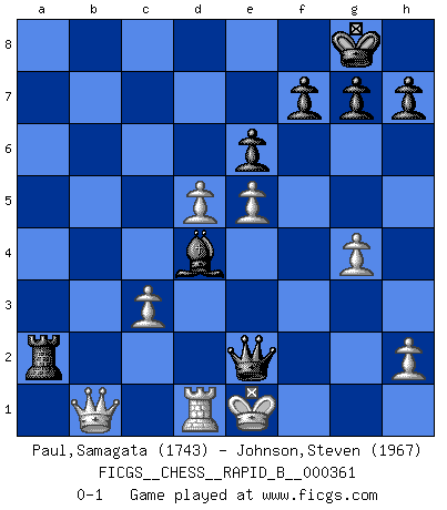 Last move : 0-1 2021 July 14 2:0:44 [Event "FICGS__CHESS__RAPID_B__000361"] [Site "FICGS"] [Date "2021.05.19"] [Round "1"] [White "Paul,Samagata"] [Black "Johnson,Steven"] [Result "0-1"] [WhiteElo "1743"] [BlackElo "1967"] 1.e4 c6 2.d4 d5 3.e5 Bf5 4.Nf3 e6 5.Nc3 Ne7 6.Be2 c5 7.O-O Nec6 8.Be3 cxd4 9.Nxd4 Nxd4 10.Bxd4 Nc6 11.Bb5 Qc7 12.Ne2 Be7 13.Re1 O-O 14.c3 a6 15.Ba4 b5 16.Bb3 a5 17.a3 Bg6 18.Rc1 Rfc8 19.g3 b4 20.axb4 axb4 21.Qd2 bxc3 22.bxc3 Rcb8 23.Bd1 Ra3 24.Nf4 Bf5 25.Be2 Qa5 26.g4 Be4 27.f3 Nxd4 28.fxe4 Nb3 29.Qb2 Ra2 30.Qb1 Qa7+ 31.Kh1 Nxc1 32.Qxc1 R8b2 33.exd5 Bh4 34.Rd1 Rxe2 35.Nxe2 Qf2 36.Qb1 Qf3+ 37.Kg1 Bf2+ 38.Kf1 Bd4 39.Ke1 Qxe2+ 0-1 Caro-Kann : Advance variation Kingside Castling by player White (move 7) Kingside Castling by player Black (move 13) Player Black won this chess game. Follow this game move after move (download)My style is somewhere between that of Tal and Petrosian. (Reshevsky) Der zweitbeste Zug ist oft der einzig richtige. (Savielly Grigorievitsch Tartakower) EL Ajedrez es como la vida. (Boris Spassky) Un millionnaire : 'Monsieur Steinitz ! Vous ne participez aux tournois que pour l'argent, alors que moi je n'y viens que pour l'honneur.' Steinitz : 'Chacun joue pour ce qu'il n'a pas'... Unless I accept my faults I will most certainly doubt my virtues. (Hugh Prather)