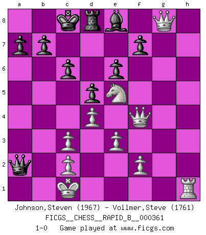 Last move : 1-0 2021 July 7 0:48:34 [Event "FICGS__CHESS__RAPID_B__000361"] [Site "FICGS"] [Date "2021.05.19"] [Round "1"] [White "Johnson,Steven"] [Black "Vollmer,Steve"] [Result "1-0"] [WhiteElo "1967"] [BlackElo "1761"] 1.d4 Nf6 2.Nc3 d5 3.Bf4 e6 4.e3 Bd6 5.Qf3 Bxf4 6.Qxf4 c6 7.h4 Qa5 8.Nf3 Na6 9.Bxa6 Qxa6 10.h5 h6 11.g4 Bd7 12.g5 hxg5 13.Qxg5 Rg8 14.Qf4 O-O-O 15.h6 Rh8 16.Ne5 Be8 17.O-O-O Ne4 18.hxg7 Rxh1 19.Rxh1 Nxc3 20.bxc3 Qxa2 21.g8Q 1-0 Queen's pawn game Queenside Castling by player Black (move 14) Queenside Castling by player White (move 17) Promotion Queen by player White (move 21) Player White won this chess game. Follow this game move after move (download)Capture of the adverse King is the ultimate but not the first object of the game. (William Steinitz) Karpov ist ein Museumsstück. (Garry Kasparov) Cuando me preguntan: -¿Cual es el secreto que te hace hacer mejores movidas que tus oponentes?, Yo respondo: Me da gusto que me pregunten eso, porque, como veran, hay una simple razón. Yo pienso mis propias movidas y dejo a mi oponente que el piense las suyas. (Alexander Alekhine) Les ravages du H expliquent la différence de niveau entre Tal et Thal [Abergel]. All art requires courage. (Anne Tucker)