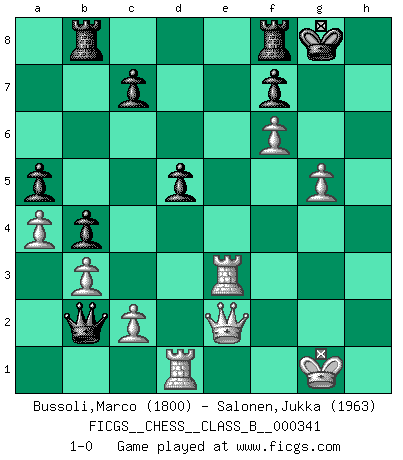 Last move : 1-0 2021 September 4 15:3:7 [Event "FICGS__CHESS__CLASS_B__000341"] [Site "FICGS"] [Date "2021.05.19"] [Round "1"] [White "Bussoli,Marco"] [Black "Salonen,Jukka"] [Result "1-0"] [WhiteElo "1800"] [BlackElo "1963"] 1.e4 e5 2.Nf3 Nc6 3.Bb5 a6 4.Ba4 Nf6 5.O-O b5 6.Bb3 Bc5 7.a4 b4 8.Nxe5 Nxe5 9.d4 Bxd4 10.Qxd4 Nc6 11.Qc5 Bb7 12.f3 d6 13.Qf2 O-O 14.Be3 Bc8 15.Nd2 Qe7 16.Bc4 Rd8 17.Rfe1 Ne5 18.Bf1 a5 19.b3 h6 20.Rad1 Nh5 21.g3 Nf6 22.Bg2 Nc6 23.Nf1 Bb7 24.g4 Qe5 25.h4 Qe8 26.Ng3 Nd7 27.g5 hxg5 28.hxg5 Nce5 29.Bd4 Nc5 30.f4 Ne6 31.fxe5 Nxd4 32.Qxd4 g6 33.Qf2 Qxe5 34.Nf5 Rf8 35.Nh6+ Kg7 36.Nf5+ Kg8 37.Re3 Rab8 38.R1d3 gxf5 39.exf5 Qb2 40.Bxb7 Rxb7 41.f6 R7b8 42.Qe2 d5 43.Rd1 1-0 Ruy Lopez : 5.O-O Kingside Castling by player White (move 5) Kingside Castling by player Black (move 13) Player White won this chess game. Follow this game move after move (download)Winning isn't everything... but losing is nothing. (Mednis) Ich könnte leicht behaupten: Ja,ja, Leonid Breschnew wollte nicht, daß ich Weltmeister werde. In der Tat war die Sache komplizierter. (Viktor Kortschnoi) El arma más poderosa en el Ajedrez, es tener la próxima movida. (David Bronstein) Il n'y a plus de joueurs du niveau de Jacob Murray dont la seule quête est le beau jeu, le plaisir de voir les pièces construire quelque chose. Sur 10 idées à la minute, 9 seront sans intérêt, la dernière s'avèrera géniale. (Christian Bauer) Never was anything great achieved without danger. (Niccolo Machiavelli)