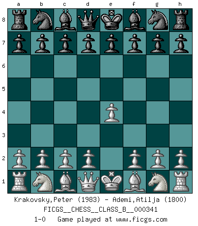 Last move : 1-0 2021 June 29 3:55:19 [Event "FICGS__CHESS__CLASS_B__000341"] [Site "FICGS"] [Date "2021.05.19"] [Round "1"] [White "Krakovsky,Peter"] [Black "Ademi,Atilja"] [Result "1-0"] [WhiteElo "1983"] [BlackElo "1800"] 1.e4 1-0 This chess game has been lost on time (started : 2021.05.19 15:57:40) King's pawn Opening Player White won this chess game. Follow this game move after move (download)We must make sure that Chess will not be like a dead language, very interesting, but for a very small group. (Sytze Faber) Eine Person mit durchschnittlichem IQ kann etwa eine ELO von 2000 erreichen. (Jonathan Levitt) No es suficiente ser un buen jugador, se debe también de jugar bién. (Siegbert Tarrasch) Demandez au pauvre Cg1 ce qu'il en pense. Eduard Gufeld à propos de la variante Saemisch de l'Est-Indienne. Shallow men believe in luck. Strong men belive in cause and effect. (Ralph Waldo Emerson)