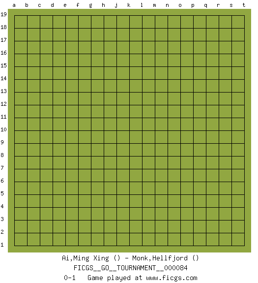 Last move : 0-1 2021 June 20 6:47:21 [Event "FICGS__GO__TOURNAMENT__000084"] [Site "FICGS"] [Date "2021.05.20"] [Round "1"] [Black "Ai,Ming Xing"] [White "Monk,Hellfjord"] [Result "0-1"] 0-1 This go game has been lost on time (started : 2021.05.20 23:1:8) Here are the names of the openings (joseki) played in the four corners : Player White won this Go (weiqi, baduk) game. Follow this game move after move (download)Grab the border points between two moyos. (Anonymous) No, I am still playing. (Anatoly Karpov)