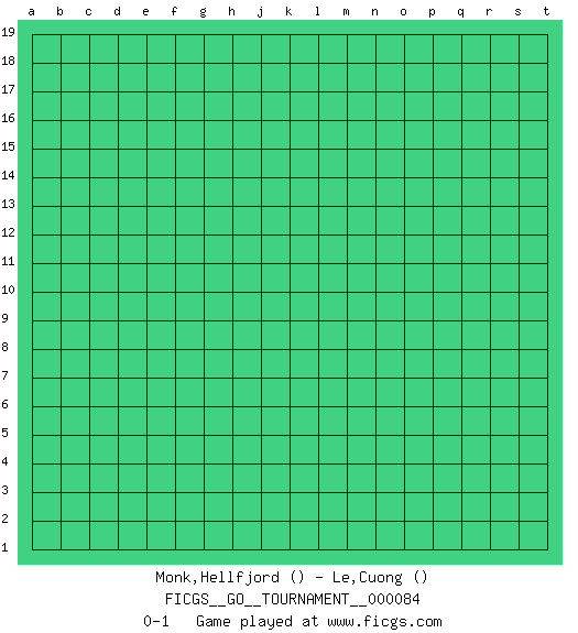 Last move : 0-1 2021 June 20 6:47:21 [Event "FICGS__GO__TOURNAMENT__000084"] [Site "FICGS"] [Date "2021.05.20"] [Round "1"] [Black "Monk,Hellfjord"] [White "Le,Cuong"] [Result "0-1"] 0-1 This go game has been lost on time (started : 2021.05.20 23:1:8) Here are the names of the openings (joseki) played in the four corners : Player White won this Go (weiqi, baduk) game. Follow this game move after move (download)In the corner, five stones in a row on the third line are alive. (Anonymous) Hardware: the parts of a computer that can be kicked. (Jeff Persis)