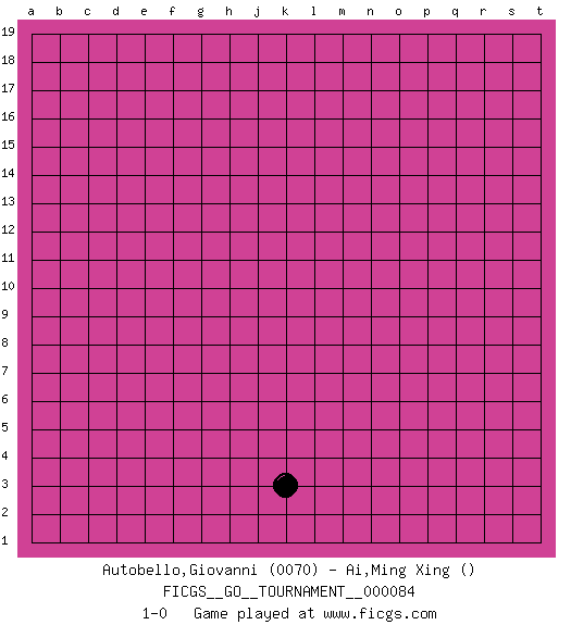 Last move : 1-0 2021 June 20 6:47:21 [Event "FICGS__GO__TOURNAMENT__000084"] [Site "FICGS"] [Date "2021.05.20"] [Round "1"] [Black "Autobello,Giovanni"] [White "Ai,Ming Xing"] [Result "1-0"] [Rating 1 "0070"] 1.k3 1-0 This go game has been lost on time (started : 2021.05.20 23:1:8) Here are the names of the openings (joseki) played in the four corners : Player Black won this Go (weiqi, baduk) game. Follow this game move after move (download)The saki bottle shape is negative. (Anonymous) Memory is a crazy woman that hoards colored rags and throws away food. (Austin O'Malley)
