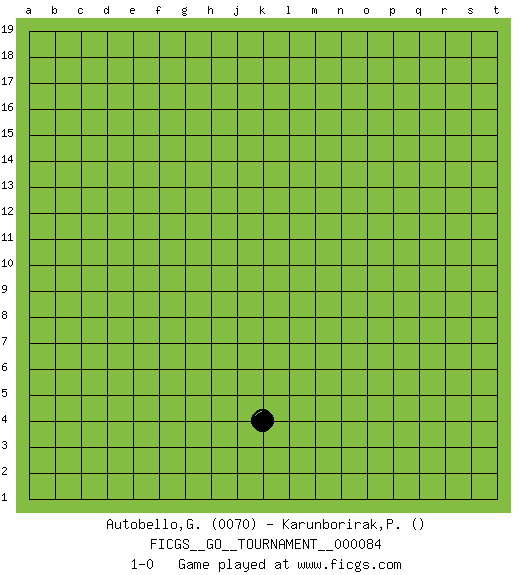 Last move : 1-0 2021 June 20 6:47:21 [Event "FICGS__GO__TOURNAMENT__000084"] [Site "FICGS"] [Date "2021.05.20"] [Round "1"] [Black "Autobello,Giovanni"] [White "Karunborirak,Pitchaya"] [Result "1-0"] [Rating 1 "0070"] 1.k4 1-0 This go game has been lost on time (started : 2021.05.20 23:1:8) Here are the names of the openings (joseki) played in the four corners : Player Black won this Go (weiqi, baduk) game. Follow this game move after move (download)Connect with good shape. (Anonymous) When the going gets tactical, the computers get going. (Hyatt)