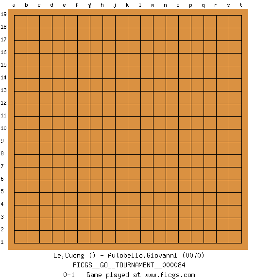 Last move : 0-1 2021 June 20 6:47:21 [Event "FICGS__GO__TOURNAMENT__000084"] [Site "FICGS"] [Date "2021.05.20"] [Round "1"] [Black "Le,Cuong"] [White "Autobello,Giovanni"] [Result "0-1"] [Rating 2 "0070"] 0-1 This go game has been lost on time (started : 2021.05.20 23:1:8) Here are the names of the openings (joseki) played in the four corners : Player White won this Go (weiqi, baduk) game. Follow this game move after move (download)Extend one hand from the cutting points. (Anonymous) You can think I'm wrong, but that's no reason to quit thinking. (Gregory House, House M.D.)