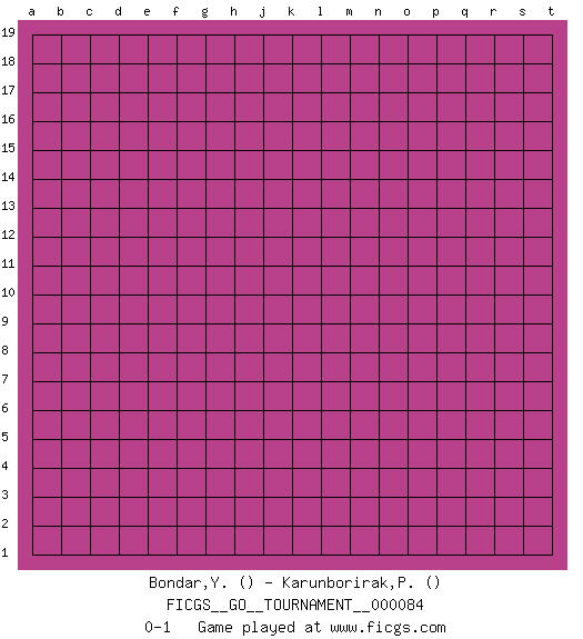 Last move : 0-1 2021 June 20 6:47:21 [Event "FICGS__GO__TOURNAMENT__000084"] [Site "FICGS"] [Date "2021.05.20"] [Round "1"] [Black "Bondar,Yevheniy"] [White "Karunborirak,Pitchaya"] [Result "0-1"] 0-1 This go game has been lost on time (started : 2021.05.20 23:1:8) Here are the names of the openings (joseki) played in the four corners : Player White won this Go (weiqi, baduk) game. Follow this game move after move (download)The simplest move is the best move. (Anonymous) Methinks King Thibault should dub Marius Zubac a knight of the square board... I mean table, henceforth addressing him as Sir Marius, and bestow on him a suitable land from the kingdom of FICGS & marry him off to a worthy, fair maiden, lest he slice our heads with his mighty sword in his wrath. (Dinesh De Silva)