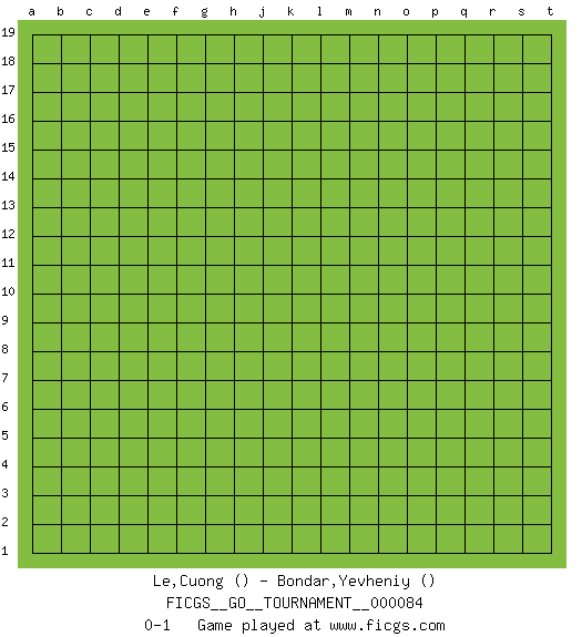 Last move : 0-1 2021 June 20 6:47:21 [Event "FICGS__GO__TOURNAMENT__000084"] [Site "FICGS"] [Date "2021.05.20"] [Round "1"] [Black "Le,Cuong"] [White "Bondar,Yevheniy"] [Result "0-1"] 0-1 This go game has been lost on time (started : 2021.05.20 23:1:8) Here are the names of the openings (joseki) played in the four corners : Player White won this Go (weiqi, baduk) game. Follow this game move after move (download)Proverbs do not apply to White. (Tero Sand) A good teacher is like a candle - it consumes itself to light the way for others. (Author unknown)