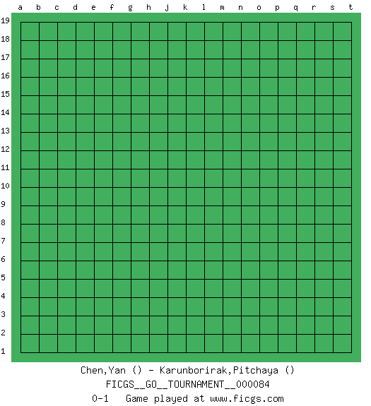 Last move : 0-1 2021 June 20 6:47:21 [Event "FICGS__GO__TOURNAMENT__000084"] [Site "FICGS"] [Date "2021.05.20"] [Round "1"] [Black "Chen,Yan"] [White "Karunborirak,Pitchaya"] [Result "0-1"] 0-1 This go game has been lost on time (started : 2021.05.20 23:1:8) Here are the names of the openings (joseki) played in the four corners : Player White won this Go (weiqi, baduk) game. Follow this game move after move (download)Avoid the plate connection. (Anonymous) Employ the attack like tactic of defense. (Chinese proverb)