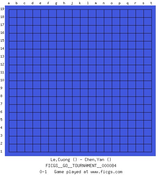 Last move : 0-1 2021 June 20 6:47:21 [Event "FICGS__GO__TOURNAMENT__000084"] [Site "FICGS"] [Date "2021.05.20"] [Round "1"] [Black "Le,Cuong"] [White "Chen,Yan"] [Result "0-1"] 0-1 This go game has been lost on time (started : 2021.05.20 23:1:8) Here are the names of the openings (joseki) played in the four corners : Player White won this Go (weiqi, baduk) game. Follow this game move after move (download)Learning josekis by heart is useless if you don't try departing from them. (Pierre Audouard) Knowledge rests not upon truth alone, but upon error also. (Carl G. Jung)