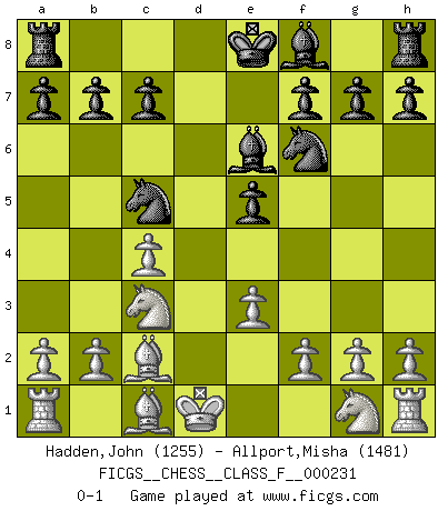 Last move : 0-1 2021 July 4 10:39:27 [Event "FICGS__CHESS__CLASS_F__000231"] [Site "FICGS"] [Date "2021.05.22"] [Round "1"] [White "Hadden,John"] [Black "Allport,Misha"] [Result "0-1"] [WhiteElo "1255"] [BlackElo "1481"] 1.d4 d6 2.c4 e5 3.dxe5 dxe5 4.e3 Qxd1+ 5.Kxd1 Nd7 6.Nc3 Ngf6 7.Bd3 Nc5 8.Bc2 Be6 0-1 This chess game has been lost on time (started : 2021.05.22 11:35:40) Old Indian defense Player Black won this chess game. Follow this game move after move (download)It began to feel as though you were playing against Chess itself. - On playing against Robert Fischer. (Walter Shipman) Ohne ihre Erfolge schmälern zu wollen würde ich sagen Petrosian, Spassky und Karpov verdanken ihre Siege ihren Trainern - Boleslavsky, Bondarevsky und Furman. (Mikhail Moiseyevich Botvinik) El ganador de una partida es aquel jugador que hace el penúltimo error. (Savielly Tartakover) Le système Elo représente seulement une moyenne. Il est simplement un indicateur de votre stabilité. (Anatoli Karpov) The weakness of an artist is dogma. (Josh Waitzkin)