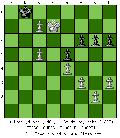 Last move : 1-0 2021 August 17 13:42:2 [Event "FICGS__CHESS__CLASS_F__000231"] [Site "FICGS"] [Date "2021.05.22"] [Round "1"] [White "Allport,Misha"] [Black "Goldmund,Heike"] [Result "1-0"] [WhiteElo "1481"] [BlackElo "1267"] 1.e4 d5 2.d3 dxe4 3.dxe4 Qxd1+ 4.Kxd1 Nf6 5.f3 e6 6.Nd2 Bc5 7.c3 O-O 8.Kc2 a6 9.h3 b5 10.Ne2 Rd8 11.a4 Bb7 12.b4 Be3 13.axb5 axb5 14.Rxa8 Bxa8 15.Nb3 Bxc1 16.Nexc1 Nbd7 17.Bxb5 Nb6 18.Nd3 c6 19.Ba6 Ne8 20.Ra1 Nc7 21.Nbc5 Kf8 22.Ne5 f6 23.Nc4 Nxc4 24.Bxc4 e5 25.Ra7 Rc8 26.Rxc7 Rxc7 27.Ne6+ Ke7 28.Nxc7 Bb7 29.Ba6 Bxa6 30.Nxa6 Kd6 31.c4 g6 32.c5+ Kd7 33.Kc3 Kc8 34.Kc4 Kb7 35.b5 Ka7 36.bxc6 Kxa6 37.Kd5 Ka7 38.Kd6 Kb8 39.Kd7 h6 40.c7+ 1-0 Scandinavian (centre counter) defense Kingside Castling by player Black (move 7) Player White won this chess game. Follow this game move after move (download)There are two classes of men; those who are content to yield to circumstances and who play whist; those who aim to control circumstances, and who play Chess. (Mortimer Collins) Im Hotelzimmer gab es nur zwei Schaben. (Über die Turnierbedingungen) (Peter Swidler) La señal de un Gran Maestro es su habilidad de ganar una partida rápidamente y sin dolor. (Irving Chernev) Les Echecs ne sont pas pour les âmes timides. Ils requièrent un homme entier, qui ne s'arrête pas aveuglément à ce qui a été déjà établi, mais qui tente individuellement de sonder les profondeurs du jeu. (W. Steinitz) The Movers & Shakers of this world are those who play chess in the mornings and go to the disco in the evenings. (Dinesh De Silva)