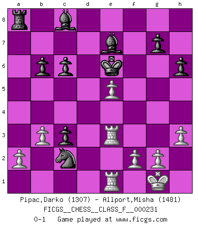Last move : 0-1 2021 June 14 22:13:48 [Event "FICGS__CHESS__CLASS_F__000231"] [Site "FICGS"] [Date "2021.05.22"] [Round "1"] [White "Pipac,Darko"] [Black "Allport,Misha"] [Result "0-1"] [WhiteElo "1307"] [BlackElo "1481"] 1.e4 e5 2.Nf3 d6 3.h3 Nf6 4.Nc3 Nbd7 5.d4 Be7 6.dxe5 dxe5 7.Bg5 h6 8.Bxf6 Bxf6 9.Bc4 c6 10.O-O O-O 11.Qd2 Nb6 12.Qxd8 Bxd8 13.Nxe5 Bf6 14.Bxf7+ Rxf7 15.Nxf7 Kxf7 16.Rfe1 Nc4 17.Na4 b5 18.b3 Na3 19.e5 Be7 20.Nb6 axb6 21.Re2 b4 22.c4 bxc3 23.Rae1 Ke6 24.Re3 Nc2 0-1 Philidor's defense Kingside Castling by player White (move 10) Kingside Castling by player Black (move 10) Player Black won this chess game. Follow this game move after move (download)Help your pieces so they can help you. (Paul Morphy) Viele Opfer benötigen überhaupt keine konkrete Berechnung. Es genügt sich die entstehende Position kurz vorzustellen, um uns davon zu überzeugen, dass das Opfer korrekt ist. (Mikhail Nekhemyevich Tal) El Ajedrez expande y enriquece tu mente. (Saudin Robovic) Demandez au pauvre Cg1 ce qu'il en pense. Eduard Gufeld à propos de la variante Saemisch de l'Est-Indienne. Chess, like love, like music, has the power to make people happy. (Siegbert Tarrasch)