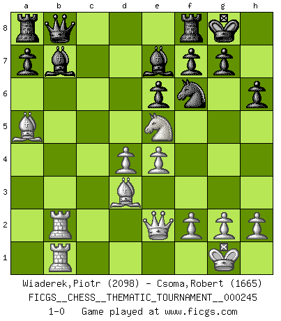 Last move : 1-0 2021 July 27 13:36:0 [Event "FICGS__CHESS__THEMATIC_TOURNAMENT__000245"] [Site "FICGS"] [Date "2021.05.25"] [Round "1"] [White "Wiaderek,Piotr"] [Black "Csoma,Robert"] [Result "1-0"] [WhiteElo "2098"] [BlackElo "1665"] 1.d4 Nf6 2.c4 e6 3.Nf3 b6 4.a3 Bb7 5.Nc3 d5 6.cxd5 Nxd5 7.Qc2 Be7 8.e4 Nxc3 9.bxc3 O-O 10.Bd3 Nd7 11.O-O c5 12.Qe2 cxd4 13.cxd4 Rc8 14.Bf4 Nf6 15.Bd2 h6 16.Rfe1 Kh8 17.a4 Qd7 18.a5 Kg8 19.Ra2 Rfd8 20.Rb1 bxa5 21.Bxa5 Rf8 22.Bd2 Ra8 23.Ne5 Qc7 24.Ba5 Qc8 25.Rc2 Qb8 26.Rcb2 1-0 Queen's Indian : Petrosian system Kingside Castling by player Black (move 9) Kingside Castling by player White (move 11) Player White won this chess game. Follow this game move after move (download)Only the player with the initiative has the right to attack. (Wilhelm Steinitz) Mit sehr nachdenklichem Gesicht schreitet Bobby durch den Turniersaal. Was ist passiert?, fragt Lombardy. Ich stehe schlecht, antwortet Fischer. Lombardy: Dann biete doch einfach Remis an. Fischer: So schlecht stehe ich nun auch wieder nicht! (Robert James Fischer) Tu sabes, camarada Pachman, no disfruto el ser un Ministro, preferería jugar al Ajedrez como tu. (Che Guevara) Lorsque vous vous retrouvez devant une position atroce, ne tendez pas un ultime piège dérisoire avec l'intention d'abandonner si l'adversaire le déjoue ! Faites-vous plutôt un devoir de résister comme si votre vie en dépendait. Jouez le coup qui vous déplairait au centuple si vous étiez dans la peau de votre tortionnaire ! Have no fear of perfection - you'll never reach it. (Salvador Dali)