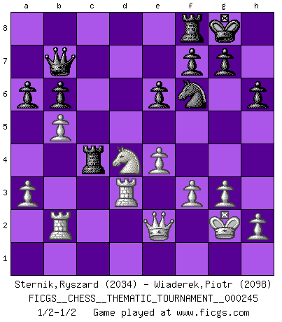 Last move : 1/2-1/2 2021 June 22 6:55:45 [Event "FICGS__CHESS__THEMATIC_TOURNAMENT__000245"] [Site "FICGS"] [Date "2021.05.25"] [Round "1"] [White "Sternik,Ryszard"] [Black "Wiaderek,Piotr"] [Result "1/2-1/2"] [WhiteElo "2034"] [BlackElo "2098"] 1.d4 Nf6 2.c4 e6 3.Nf3 b6 4.a3 Bb7 5.Nc3 d5 6.cxd5 Nxd5 7.Bd2 Nxc3 8.Bxc3 Bd6 9.g3 Nd7 10.Bg2 O-O 11.O-O Nf6 12.Nd2 Bxg2 13.Kxg2 Be7 14.e4 Rc8 15.Qe2 c5 16.dxc5 Rxc5 17.Rfd1 Qa8 18.f3 Qb7 19.Nb3 Rc7 20.Nd4 a6 21.Bb4 Rfc8 22.Bxe7 Rxe7 23.b4 Rd7 24.Rd3 h6 25.Rad1 Rdc7 26.b5 Rc4 27.R1d2 Rf8 28.Rb2 1/2-1/2 Queen's Indian : Petrosian system Kingside Castling by player Black (move 10) Kingside Castling by player White (move 11) This chess game ended in a draw. Follow this game move after move (download)Chess is in its essence a game, in its form an art, and in its execution a science. (Baron Tassilo) Ein Schachspiel besteht aus drei Phasen: Die erste, wenn du hofftst den Vorteil zu haben, die zweite, wenn du glaubst einen Vorteil zu haben, und die dritte.... wenn du weißt Du wirst verlieren. (Savielly Grigorievitsch Tartakower) El jugador táctico sabe que hacer cuando hay algo que hacer; mientras que el estratega sabe que hacer cuando no hay nada que hacer. (Gerald Abrahams) Les échecs sont plus proches de l'art de l'assassinat que de l'art de la guerre. (Arturo Perez-Reverte) The meaning of life is that it is to be lived, and it is not to be traded and conceptualized and squeezed into a pattern of systems. (Bruce Lee)