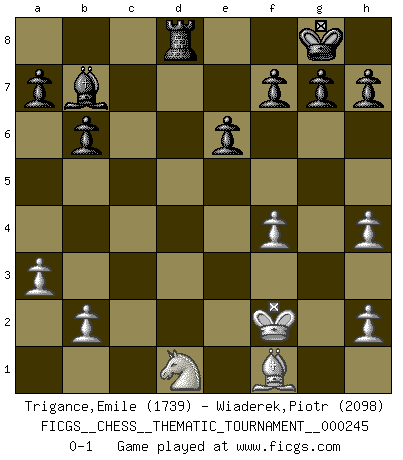 Last move : 0-1 2021 July 6 19:33:29 [Event "FICGS__CHESS__THEMATIC_TOURNAMENT__000245"] [Site "FICGS"] [Date "2021.05.25"] [Round "1"] [White "Trigance,Emile"] [Black "Wiaderek,Piotr"] [Result "0-1"] [WhiteElo "1739"] [BlackElo "2098"] 1.d4 Nf6 2.c4 e6 3.Nf3 b6 4.a3 Bb7 5.Nc3 d5 6.cxd5 Nxd5 7.e3 Be7 8.Bb5+ c6 9.Bd3 c5 10.Bd2 Nf6 11.O-O Nc6 12.Qc2 cxd4 13.exd4 O-O 14.Rfe1 Nxd4 15.Nxd4 Qxd4 16.Be3 Qh4 17.Bf1 Bd6 18.g3 Ng4 19.f4 Nxe3 20.Rxe3 Bc5 21.gxh4 Bxe3+ 22.Qf2 Bxf2+ 23.Kxf2 Rfd8 24.Rd1 Rxd1 25.Nxd1 Rd8 0-1 Queen's Indian : Petrosian system Kingside Castling by player White (move 11) Kingside Castling by player Black (move 13) Player Black won this chess game. Follow this game move after move (download)By the beauty of his games, the clarity of his play, and the brilliance of his ideas, Fischer made himself an artist of the same stature as Brahms, Rembrandt, and Shakespeare. (David Levy) Stelle das Brett so, daß die Sonne in die Augen deines Gegners scheint. (Ruy López) A la fecha, Fischer esta simplemente un nivel arriba de todos los mejores jugadores de Ajedrez del mundo. (John Jacobs) Je crois qu'il existe des manières très spécifiques de jouer efficacement contre une machine. Evidemment, nous n'avons aucune chance en technique pure, parce que l'ordinateur calcule de manière parfaite. Mais lorsque nous faisons appel à notre cerveau, en utilisant l'intuition et la compréhension, alors nous restons beaucoup plus forts. (Anatoli Karpov) Somehow our devils are never quite what we expect when we meet them face to face. (Nelson DeMille)