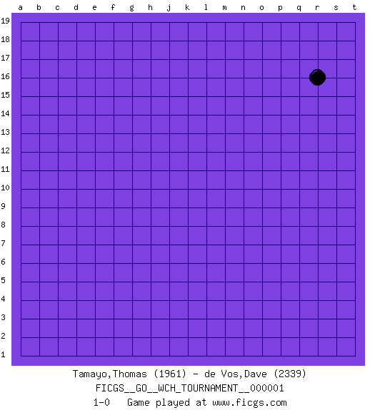 Last move : 1-0 2007 August 12 3:19:15 [Event "FICGS__GO__WCH_TOURNAMENT__000001"] [Site "FICGS"] [Date "2007.07.12"] [Round "1"] [Black "Tamayo,Thomas"] [White "de Vos,Dave"] [Result "1-0"] [Rating 1 "1961"] [Rating 2 "2339"] 1.r16 1-0 This go game has been lost on time (started : 2007.07.12 21:8:8) Here are the names of the openings (joseki) played in the four corners : Player Black won this Go (weiqi, baduk) game. Follow this game move after move (download)A few moments to learn, a lifetime to master. (Ancient proverb) Follow your passion, and success will follow you. (Arthur Buddhold)