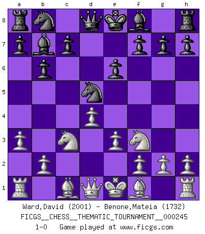 Last move : 1-0 2021 July 5 15:28:28 [Event "FICGS__CHESS__THEMATIC_TOURNAMENT__000245"] [Site "FICGS"] [Date "2021.05.25"] [Round "1"] [White "Ward,David"] [Black "Benone,Mateia"] [Result "1-0"] [WhiteElo "2001"] [BlackElo "1732"] 1.d4 Nf6 2.c4 e6 3.Nf3 b6 4.a3 Bb7 5.Nc3 d5 6.cxd5 Nxd5 7.e3 1-0 This chess game has been lost on time (started : 2021.05.25 13:55:45) Queen's Indian : Petrosian system Player White won this chess game. Follow this game move after move (download)Fischer is an American Chess tragedy on par with Morphy and Pillsbury. (Mig Greengard) Was ist der Unterschied zwischen einem Strassenarbeiter und einem Schachspieler? --Der Schachspieler bewegt sich ab und zu. (Anonymous) Vive, pierde y aprende al observar a tu oponente como gana. (Amber Steenbock) Il a essayé de se convaincre qu'il pourrait empêcher toutes les erreurs et ne jamais perdre. L'horreur ! Gary Kasparov au sujet de Robert Fischer. You think that education is too expensive ? Try ignorance. (Derek Bok)