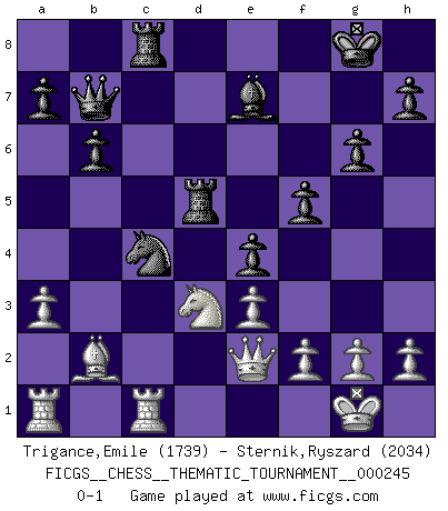 Last move : 0-1 2021 July 12 8:45:51 [Event "FICGS__CHESS__THEMATIC_TOURNAMENT__000245"] [Site "FICGS"] [Date "2021.05.25"] [Round "1"] [White "Trigance,Emile"] [Black "Sternik,Ryszard"] [Result "0-1"] [WhiteElo "1739"] [BlackElo "2034"] 1.d4 Nf6 2.c4 e6 3.Nf3 b6 4.a3 Bb7 5.Nc3 d5 6.cxd5 Nxd5 7.e3 Nxc3 8.bxc3 Be7 9.Bd3 O-O 10.O-O c5 11.Ne1 Nc6 12.Qc2 g6 13.Be4 Qc7 14.Bb2 Na5 15.Bxb7 Qxb7 16.c4 cxd4 17.Bxd4 Rac8 18.c5 e5 19.Bb2 Rxc5 20.Qe2 Rfc8 21.Qg4 Nc4 22.Nd3 Rd5 23.Rfc1 f5 24.Qe2 e4 0-1 Queen's Indian : Petrosian system Kingside Castling by player Black (move 9) Kingside Castling by player White (move 10) Player Black won this chess game. Follow this game move after move (download)The laws of Chess do not permit a free choice: you have to move whether you like it or not. (Emanuel Lasker) Es ist besser die Steine des Gegners zu opfern. (Savielly Grigorievitsch Tartakower) El Ajedrez es un expediente tonto que hace creer a la gente inactiva que hacen una cosa muy astuta cuando solamente estan perdiendo su tiempo. (George Bernard Shaw) Les Echecs représentent une sphère d'idées créatrices basée sur la volonté des deux protagonistes. (Smyslov) There are more things in heaven and earth than practically anywhere else. (Unknown)