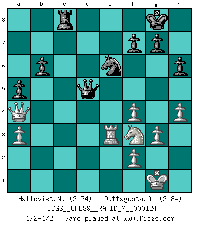 Last move : 1/2-1/2 2021 September 19 23:57:53 [Event "FICGS__CHESS__RAPID_M__000124"] [Site "FICGS"] [Date "2021.05.27"] [Round "1"] [White "Hallqvist,Niklas"] [Black "Duttagupta,Aniruddha"] [Result "1/2-1/2"] [WhiteElo "2174"] [BlackElo "2184"] 1.c4 e5 2.g3 Nf6 3.Bg2 d5 4.cxd5 Nxd5 5.Nf3 Nc6 6.O-O Nb6 7.d3 Be7 8.Nc3 O-O 9.a3 Re8 10.Ne4 Be6 11.Bg5 Nd4 12.Bxe7 Nxf3+ 13.Bxf3 Qxe7 14.Qc2 Bd5 15.Nc5 c6 16.b4 Bxf3 17.exf3 Nd5 18.Rfe1 b6 19.Nb3 Qf6 20.Nd2 Nc7 21.Re4 Ne6 22.Qc3 c5 23.Rae1 Red8 24.Rxe5 cxb4 25.Qxb4 Rxd3 26.f4 h6 27.Nf3 Rc8 28.R5e3 Rxe3 29.Rxe3 Qf5 30.Qa4 Qd5 31.h4 a5 1/2-1/2 English Opening Kingside Castling by player White (move 6) Kingside Castling by player Black (move 8) This chess game ended in a draw. Follow this game move after move (download)I guess a certain amount of temperament is expected of Chess geniuses. (Ron Gross) Im Schach nämlich geht es darum, daß Ich des Gegners klein zu kriegen, sein Ego zu zerbrechen und zu zermahlen, seine Selbstachtung zu zertreten und zu verscharren und seine ganze mißachtenswerte sogenannte Persönlichkeit ein für alle Mal tot zu hacken und zu zerstampfen und dadurch die menschliche Gesellschaft von einer stinkenden Pestbeule zu befreien. Es ist ein königliches Spiel. (Robert James Fischer) El Ajedrez es tan interesante por sí solo, que no es necesario un interés monetario para persuadir a una persona a que lo practique; por lo tanto, nunca se juega por dinero. (Benjamin Franklin) Je fais ceci parce que dans cinquante coups j'obtiendrai cela; je m'appelle Mikhail Moisevitch Botvinnik. (Botvinnik) In fact if nothing is done against this teddy bear, hereby I announce that I would quit chess, rapid chess, blitz chess, postal chess, email chess, server chess and correspondence chess I will then switch to a table game where teddy bears aren't going to be seen for a while, like Poker, or Roulette, all 18+ games. (Elmer Valderrama)