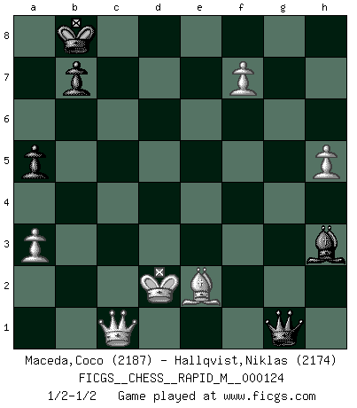 Last move : 1/2-1/2 2021 September 28 16:58:17 [Event "FICGS__CHESS__RAPID_M__000124"] [Site "FICGS"] [Date "2021.05.27"] [Round "1"] [White "Maceda,Coco"] [Black "Hallqvist,Niklas"] [Result "1/2-1/2"] [WhiteElo "2187"] [BlackElo "2174"] 1.e4 e6 2.d4 d5 3.Nc3 Bb4 4.e5 c5 5.a3 Bxc3+ 6.bxc3 Ne7 7.Qg4 Qc7 8.Qxg7 Rg8 9.Qxh7 cxd4 10.Ne2 Nbc6 11.f4 Bd7 12.Qd3 dxc3 13.Qxc3 Nf5 14.Rb1 d4 15.Qd3 O-O-O 16.Rg1 Na5 17.g4 Ba4 18.gxf5 Bxc2 19.Qb5 Rh8 20.fxe6 Bxb1 21.Bd2 Nc4 22.e7 Nxd2 23.exd8Q+ Rxd8 24.Kxd2 Qc2+ 25.Ke1 d3 26.Kf2 dxe2 27.Bxe2 Ba2 28.Rg3 Kb8 29.h4 Qc1 30.Qb4 a5 31.Qe4 Bd5 32.Qe3 Qh1 33.h5 Qh4 34.Kf1 Rc8 35.Rg1 Qh2 36.f5 Be4 37.e6 Bxf5 38.exf7 Rc1+ 39.Qxc1 Bh3+ 40.Ke1 Qxg1+ 41.Kd2 Qg5+ 42.Kd1 Qg1+ 43.Kd2 1/2-1/2 French : Winawer, Advance, poisoned pawn variation Queenside Castling by player Black (move 15) Promotion Queen by player White (move 23) This chess game ended in a draw. Follow this game move after move (download)After black's reply to 1.e4 with 1..e5, leaves him always trying to get into the game. (Howard Staunton) Kann Schach nicht schließlich das Nationalspiel der Deutschen werden? Und welche weiteren Ausblicke bieten sich dann dar! Welche Hebung des allgemeinen Kultur-Niveaus, ja der Moral, wenn das Schachbrett den Kartentisch verdrängen würde! Wahrlich, ein Ziel, des Schweißes der Edlen wert! (Siegbert Tarrasch) Coloca el contenido de las piezas del Ajedrez en un sombrero, agitalo vigorosamente, arrojalas en un tablero desde una altura de 30 centimetros y así obtendras el estilo de Steinitz. (H. E. Bird) On entre au jeu d'Echecs comme on entre en Religion. Pour le joueur d'Echecs, la partie d'Echecs c'est l'office, la messe, le défilé du 1er Mai, le dépôt de gerbe au Monument aux Morts. C'est un drame sacré. (Michel Roos) Treat your password like your toothbrush. Don't let anybody else use it, and get a new one every six months. (Clifford Stoll)