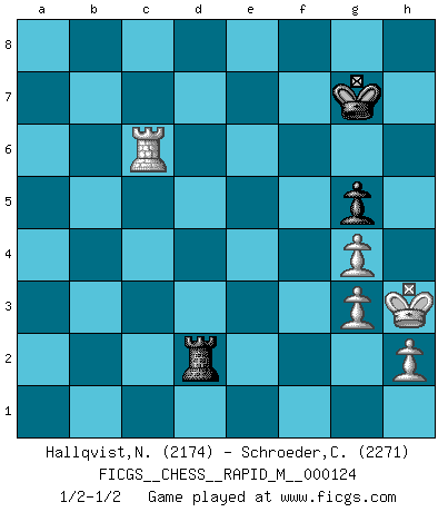 Last move : 1/2-1/2 2021 August 15 7:45:50 [Event "FICGS__CHESS__RAPID_M__000124"] [Site "FICGS"] [Date "2021.05.27"] [Round "1"] [White "Hallqvist,Niklas"] [Black "Schroeder,Christoph"] [Result "1/2-1/2"] [WhiteElo "2174"] [BlackElo "2271"] 1.c4 f5 2.g3 Nf6 3.Nf3 d6 4.d4 g6 5.Bg2 Bg7 6.Nc3 O-O 7.O-O Qe8 8.Re1 Qf7 9.e4 fxe4 10.Nxe4 Nc6 11.Neg5 Qxc4 12.Bd2 Kh8 13.b4 h6 14.Rc1 Qxa2 15.Bf1 d5 16.Bc3 Qa3 17.Nh4 hxg5 18.Nxg6+ Kg8 19.Nxf8 Kxf8 20.Re3 Bg4 21.f3 Ne4 22.fxg4 Nxc3 23.Rexc3 Qxb4 24.Kh1 Bf6 25.Rb3 Qd6 26.Rxb7 Kg7 27.Bg2 Rh8 28.Qe1 Bxd4 29.Rxc6 Qxc6 30.Qxe7+ Kh6 31.Rxc7 Qe8 32.Bxd5 Qxe7 33.Rxe7 Kg6 34.Re4 Bc3 35.Re6+ Kg7 36.Re7+ Kf6 37.Rxa7 Rd8 38.Ra3 Rxd5 39.Rxc3 Rd1+ 40.Kg2 Rd2+ 41.Kh3 Kg6 42.Rc6+ Kg7 1/2-1/2 English : Anglo-Dutch defense Kingside Castling by player Black (move 6) Kingside Castling by player White (move 7) 10 pieces endgame at move 37 : White KRBPPP , Black KRBP WHITE : King + 1 Rook 1 Bishop 3 Pawns BLACK : King + 1 Rook 1 Bishop 1 Pawn 9 pieces endgame at move 38 : White KRPPP , Black KRBP WHITE : King + 1 Rook 3 Pawns BLACK : King + 1 Rook 1 Bishop 1 Pawn 8 pieces endgame at move 39 : White KRPPP , Black KRP WHITE : King + 1 Rook 3 Pawns BLACK : King + 1 Rook 1 Pawn This chess game ended in a draw. Follow this game move after move (download)A win by an unsound combination, however showy, fills me with artistic horror. (Wilhelm Steinitz) Es ist wirklich schade, dass so viele Schachspieler nicht auf ihr Äußeres achten! (Alexandra Kosteniuk) El Ajedrez es una manera fabulosa para que los niños aprendan a autovalorarse y a autoestimarse. (Saudin Robovic) En blitz, le Cavalier l'emporte sur le Fou. (Vlastimil Hort) The production of too many useful things results in too many useless people. (Karl Marx)