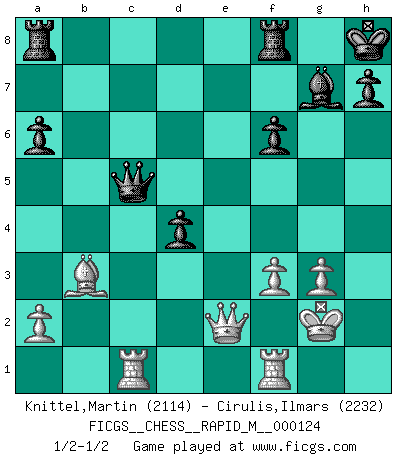 Last move : 1/2-1/2 2021 October 10 12:31:6 [Event "FICGS__CHESS__RAPID_M__000124"] [Site "FICGS"] [Date "2021.05.27"] [Round "1"] [White "Knittel,Martin"] [Black "Cirulis,Ilmars"] [Result "1/2-1/2"] [WhiteElo "2114"] [BlackElo "2232"] 1.Nf3 d5 2.d4 c6 3.Bf4 Nf6 4.e3 Bf5 5.c4 Qb6 6.Qc1 Nbd7 7.Nc3 e6 8.c5 Qd8 9.b4 Nh5 10.Be5 f6 11.Bg3 g5 12.b5 a6 13.bxc6 bxc6 14.Be2 Nxg3 15.hxg3 Bg6 16.Bd1 Bg7 17.Bc2 O-O 18.O-O e5 19.e4 g4 20.exd5 gxf3 21.dxc6 exd4 22.cxd7 fxg2 23.Kxg2 Qxd7 24.Bb3+ Kh8 25.Ne2 Bd3 26.Qd1 Qc6+ 27.f3 Bxe2 28.Qxe2 Qxc5 29.Rac1 1/2-1/2 Reti Opening Kingside Castling by player Black (move 17) Kingside Castling by player White (move 18) This chess game ended in a draw. Follow this game move after move (download)You know you're going to lose. Even when I was ahead I knew I was going to lose. - On playing against Fischer. (Andrew Soltis) Ich moechte nie einem Club beitreten, der Leute wie mich als Mitglieder aufnimmt. (Woody Allen) Preferería tener un Peón que un dedo. (Reuben Fine) Les échecs sont un jeu terrible. Si vous n'avez pas le centre, votre adversaire a une position plus libre. Par contre, si vous avez le centre, alors vous avez vraiment quelque chose pour laquelle vous inquiéter ! (Siegbert Tarrasch) Good decisions come from experience, and experience comes from bad decisions. (Anonymous)