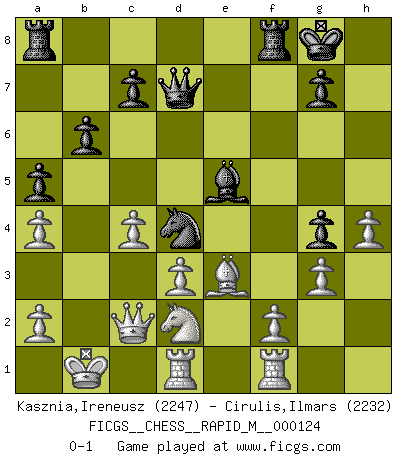Last move : 0-1 2021 August 16 10:31:14 [Event "FICGS__CHESS__RAPID_M__000124"] [Site "FICGS"] [Date "2021.05.27"] [Round "1"] [White "Kasznia,Ireneusz"] [Black "Cirulis,Ilmars"] [Result "0-1"] [WhiteElo "2247"] [BlackElo "2232"] 1.Nf3 d5 2.g3 h5 3.Bg2 h4 4.Nxh4 e5 5.c4 d4 6.d3 Nc6 7.Nf3 Nf6 8.Bg5 a5 9.Nbd2 Qd7 10.h4 Ng4 11.Ne4 f5 12.Ned2 Nd8 13.Qc2 Ne6 14.Bh3 Bd6 15.e4 dxe3 16.Bxe3 b6 17.O-O-O Bb7 18.Kb1 O-O 19.Rhf1 Bc6 20.Bxg4 Ba4 21.b3 fxg4 22.Nxe5 Bxe5 23.bxa4 Nd4 0-1 This chess game has been lost on time (started : 2021.05.27 12:10:46) Reti : King's Indian attack (Barcza system) Queenside Castling by player White (move 17) Kingside Castling by player Black (move 18) Player Black won this chess game. Follow this game move after move (download)Many have become Chess Masters, no one has become the Master of Chess. (Siegbert Tarrasch) Ohne Leiden bildet sich kein Charakter. (Ernst Freiherr von Feuchtersleben) A la fecha, Fischer esta simplemente un nivel arriba de todos los mejores jugadores de Ajedrez del mundo. (John Jacobs) D'abord les bases : Jouez et étudiez, puis étudiez et jouez, ensuite jouez et étudiez, puis étudiez et jouez. Deuxièmement : Donnez toujours le meilleur de vous-même ! (Ken Smith) Work expands to fill the time available. (C. Northcote Parkinson, in Parkinson's Laws)