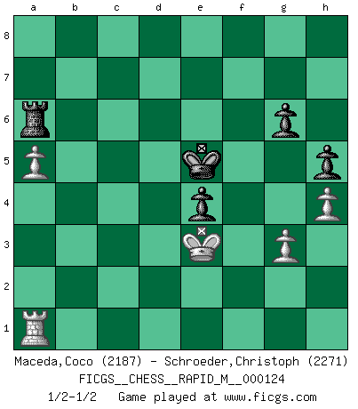 Last move : 1/2-1/2 2021 September 3 1:11:31 [Event "FICGS__CHESS__RAPID_M__000124"] [Site "FICGS"] [Date "2021.05.27"] [Round "1"] [White "Maceda,Coco"] [Black "Schroeder,Christoph"] [Result "1/2-1/2"] [WhiteElo "2187"] [BlackElo "2271"] 1.d4 Nf6 2.c4 c5 3.d5 b5 4.cxb5 a6 5.bxa6 g6 6.Nc3 Bxa6 7.e4 Bxf1 8.Kxf1 d6 9.Nf3 Bg7 10.g3 O-O 11.Kg2 Qc8 12.Re1 Qb7 13.Qe2 Na6 14.a4 Nb4 15.Rd1 Rfb8 16.Bg5 h6 17.Bxf6 Bxf6 18.Rd2 Bg7 19.e5 dxe5 20.Rad1 Rc8 21.h4 c4 22.Nxe5 Ra6 23.Qe4 f5 24.Qf4 Bxe5 25.Qxe5 Nd3 26.Qd4 e5 27.Qe3 f4 28.Qe4 Qf7 29.b3 fxg3 30.fxg3 Rf6 31.Qg4 Rf8 32.Ne4 Rf2+ 33.Nxf2 Nxf2 34.Rxf2 Qxf2+ 35.Kh3 Qc2 36.d6 Kh7 37.Re1 h5 38.Qe4 cxb3 39.Qxc2 bxc2 40.Rc1 Rd8 41.Rxc2 Rxd6 42.a5 e4 43.Kg2 Ra6 44.Ra2 Kg7 45.Kf2 Kf6 46.Ke3 Kf5 47.Ra3 Ke5 48.Ra1 1/2-1/2 Benko gambit accepted Kingside Castling by player Black (move 10) 10 pieces endgame at move 41 : White KRPPP , Black KRPPP WHITE : King + 1 Rook 3 Pawns BLACK : King + 1 Rook 3 Pawns This chess game ended in a draw. Follow this game move after move (download)I don't believe in psychology. I believe in good moves. (Bobby Fischer) Glücklicherweise sind Großmeister Ruben Fines reine Schachbücher weniger phallozentrisch [als seine Schachpsychologie] und deswegen auch weniger lächerlich. (Nigel Short) El Ajedrez era la lengua materna de Capablanca. (Reti) Donnez-moi un Cavalier en 6e et je gagnerais toutes mes parties. (Steinitz) It is not true that people stop pursuing dreams because they grow old, they grow old because they stop pursuing dreams. (Gabriel Garcia Marquez)