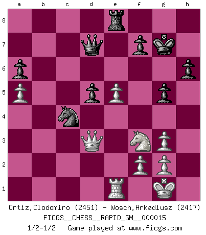 Last move : 1/2-1/2 2021 July 28 20:10:39 [Event "FICGS__CHESS__RAPID_GM__000015"] [Site "FICGS"] [Date "2021.05.30"] [Round "1"] [White "Ortiz,Clodomiro"] [Black "Wosch,Arkadiusz"] [Result "1/2-1/2"] [WhiteElo "2451"] [BlackElo "2417"] 1.d4 Nf6 2.c4 e6 3.Nf3 d5 4.Nc3 c6 5.Bg5 Nbd7 6.cxd5 exd5 7.e3 h6 8.Bh4 g5 9.Bg3 Nh5 10.Bd3 Nxg3 11.hxg3 Bg7 12.O-O O-O 13.b4 Nb6 14.a4 Qd6 15.b5 Be6 16.bxc6 bxc6 17.Rc1 Rfc8 18.e4 Rab8 19.e5 Qd7 20.a5 Nc4 21.Na4 Bf8 22.Bc2 Bf5 23.Ne1 c5 24.Nxc5 Bxc5 25.dxc5 Rxc5 26.Nf3 Nb2 27.Qd2 Rxc2 28.Rxc2 Nc4 29.Qc3 Bxc2 30.Qxc2 Re8 31.Re1 a6 32.Qd3 Kg7 33.Qd4 Re6 34.Qd3 Re8 35.Qd4 Re6 36.Qd3 Re8 1/2-1/2 Queen's pawn game Kingside Castling by player White (move 12) Kingside Castling by player Black (move 12) This chess game ended in a draw. Follow this game move after move (download)Capture of the adverse King is the ultimate but not the first object of the game. (William Steinitz) Alle Schachspieler sollten auch ein Hobby haben. (Savielly Grigorievitsch Tartakower) No hay precio que sea tan grande por la cabellera del Rey enemigo. (Koblentz) Shah mat. Le roi est mort. Cri de fierté d'un joueur venant de terrasser son adversaire, courtoisement, sans effusion de sang. Looking at the proliferation of personal web pages on the Net, it looks like very soon everyone on Earth will have 15 megabytes of fame. (M.G. Sriram)
