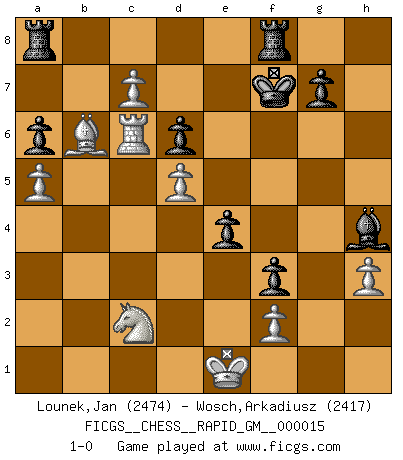 Last move : 1-0 2021 July 28 20:5:50 [Event "FICGS__CHESS__RAPID_GM__000015"] [Site "FICGS"] [Date "2021.05.30"] [Round "1"] [White "Lounek,Jan"] [Black "Wosch,Arkadiusz"] [Result "1-0"] [WhiteElo "2474"] [BlackElo "2417"] 1.e4 c5 2.Nf3 d6 3.d4 cxd4 4.Nxd4 Nf6 5.Nc3 a6 6.h3 e5 7.Nde2 h5 8.g3 Be6 9.Bg2 b5 10.a4 b4 11.Nd5 Nxd5 12.exd5 Bf5 13.c3 bxc3 14.Nxc3 Be7 15.O-O Nd7 16.a5 Rb8 17.Ra3 Nf6 18.Qa4+ Bd7 19.Qc4 Qc8 20.Qxc8+ Bxc8 21.b3 Nd7 22.Be3 O-O 23.Rb1 Nc5 24.b4 Bf5 25.bxc5 Bxb1 26.c6 Bd3 27.Bb6 f5 28.Na2 e4 29.c7 Ra8 30.Nb4 Bb5 31.Bf1 Bxf1 32.Kxf1 Kf7 33.Rc3 Bg5 34.Ke2 h4 35.gxh4 Bxh4 36.Rc6 f4 37.Nc2 f3+ 38.Ke1 1-0 Sicilian : Najdorf, Adams attack Kingside Castling by player White (move 15) Kingside Castling by player Black (move 22) Player White won this chess game. Follow this game move after move (download)When you don't know what to play, wait for an idea to come into your opponent's mind. You may be sure that idea will be wrong. (Siegbert Tarrasch) Wenn es im Universum noch irgendwo intelligente Lebewesen gibt, dann kennen sie Go. (Emanuel Lasker) Los problemas de Ajedrez exigen del compositor las mismas virtudes que caracterizan todo el arte de valor: originalidad, invención, concisión, armonÃa, complejidad e insinceridad explendida. (Vladimir Nabokov) Roi des jeux et jeu des rois, les échecs portent en eux un sentiment d'infini. Ils donnent à celui qui s'est efforcé d'en approfondir les arcanes l'impression de n'être pas à la mesure de l'homme; en fait, ils constituent un résumé de l'univers, un microcosme, et figurent cette grande échelle qui, dans les plans de la lumière descend jusqu'à la matière, qui des abîmes insondables remonte jusqu'en l'infini de Dieu. (Pyrame) Perfection is achieved, not when there is nothing more to add, but when there is nothing left to take away. (Antoine de Saint-Exupéry)