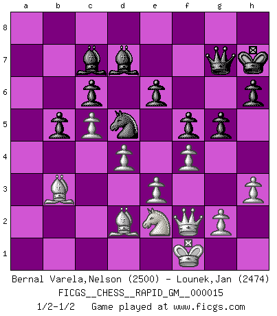 Last move : 1/2-1/2 2021 August 4 11:16:45 [Event "FICGS__CHESS__RAPID_GM__000015"] [Site "FICGS"] [Date "2021.05.30"] [Round "1"] [White "Bernal Varela,Nelson"] [Black "Lounek,Jan"] [Result "1/2-1/2"] [WhiteElo "2500"] [BlackElo "2474"] 1.Nf3 Nf6 2.d4 d5 3.c4 c6 4.Nc3 e6 5.e3 Nbd7 6.Qc2 Bd6 7.Bd3 O-O 8.O-O dxc4 9.Bxc4 a6 10.Rd1 b5 11.Bd3 Bb7 12.Ng5 h6 13.Nge4 Bc7 14.a3 Qe7 15.b4 a5 16.Rb1 axb4 17.axb4 Rfd8 18.f4 Nd5 19.Nc5 Bc8 20.Bd2 Ra3 21.Ne2 f5 22.Ra1 Rxa1 23.Rxa1 Nxc5 24.bxc5 Bd7 25.h3 Qf8 26.Qb2 Ra8 27.Bc2 Qd8 28.Bb3 Rxa1+ 29.Qxa1 g5 30.Qf1 Qe7 31.Qf3 Qf7 32.Qf2 Qg7 33.Kf1 Kh7 1/2-1/2 Reti Opening Kingside Castling by player Black (move 7) Kingside Castling by player White (move 8) This chess game ended in a draw. Follow this game move after move (download)It is not enough to be a good player... you must also play well. (Siegbert Tarrasch) Sehr viele beherrschen heutzutage das große Einmalseins des Schachspiels und kennen sogar dessen Logarithmentafeln auswendig - deshalb sollte man hin und wieder zu beweisen trachten, dass zwei mal zwei auch fünf sein kann. (Mikhail Nekhemyevich Tal) Coloca el contenido del tablero de Ajedrez en un sombrero, agita las piezas vigorosamente, derrámalas en el tablero desde una altura de medio metro y así obtienes el estilo de Wilhelm Steinitz. (H. E. Bird) Les échecs c'est le défi de l'alpiniste, toujours plus haut, prêt à tout pour monter à l'assaut du Roi ennemi. Les échecs, c'est de la musique en mouvement, un ballet majestueux pour les yeux. C'est de la poésie composée par les fantômes du passé qui au même titre que Rimbaud ou Verlaine méritent notre admiration. Les échecs, c'est de la peinture ou le moindre mouvement modifie le tableau pour en faire un Picasso ou un Van Gogh. Les échecs, c'est tout et rien, c'est la vie et la mort. Jjulie33 sur le forum de France-Echecs. The existence of forgetting has never been proved: We only know that some things don't come to mind when we want them. (Friedrich Nietzsche)
