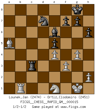 Last move : 1/2-1/2 2021 June 11 14:19:57 [Event "FICGS__CHESS__RAPID_GM__000015"] [Site "FICGS"] [Date "2021.05.30"] [Round "1"] [White "Lounek,Jan"] [Black "Ortiz,Clodomiro"] [Result "1/2-1/2"] [WhiteElo "2474"] [BlackElo "2451"] 1.e4 e5 2.Nf3 Nc6 3.Bb5 Nf6 4.d3 Bc5 5.c3 O-O 6.O-O d5 7.Nbd2 dxe4 8.dxe4 Qe7 9.b4 Bd6 10.a3 a5 11.Bb2 Be6 12.Qe2 h6 13.Rfe1 Nd7 14.Nc4 Na7 15.Nxa5 Nxb5 16.Qxb5 Rfb8 17.Bc1 Nf6 18.Qd3 c5 19.Be3 Bc7 20.Bxc5 Qd7 21.Qxd7 Nxd7 22.Be3 Bxa5 23.bxa5 Rxa5 24.Reb1 b6 25.Ne1 Ra6 26.a4 Rba8 27.f3 Rxa4 28.Rxa4 Rxa4 29.Bxb6 Ra3 30.g4 Rxc3 31.Ba5 1/2-1/2 Ruy Lopez : Berlin defense Kingside Castling by player Black (move 5) Kingside Castling by player White (move 6) This chess game ended in a draw. Follow this game move after move (download)There is no remorse like the remorse of Chess. (H. G. Wells) Der Verteidiger gebe der Gewalt nach, aber nur der Gewalt. Er schaffe sich nicht freiwillig, etwa aus Blindheit oder aus Schrecken, irgendwelche Schwächen. Er lasse sich nicht bluffen. (Emanuel Lasker) Bobby Fischer es el jugador de Ajedrez mas grande que jamás haya existido. (Ken Smith) Le pion, dans sa simplicité, marche droit devant lui, mais lorsqu'il prend, il le fait obliquement? Ainsi l'homme, tant qu'il reste pauvre, marche dans la droiture et vit honnêtement, mais lorsqu'il recherche les honneurs, il flatte, se parjure et, par les voies obliques, cherche une position supérieure sur l'échiquier du monde. (Jean de Galles) To send light into the darkness of men's hearts - such is the duty of the artist. (Schumann)