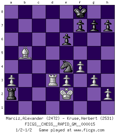 Last move : 1/2-1/2 2021 June 26 17:35:55 [Event "FICGS__CHESS__RAPID_GM__000015"] [Site "FICGS"] [Date "2021.05.30"] [Round "1"] [White "Marciz,Alexander"] [Black "Kruse,Herbert"] [Result "1/2-1/2"] [WhiteElo "2472"] [BlackElo "2531"] 1.d4 Nf6 2.c4 e6 3.Nf3 b6 4.a3 Bb7 5.Nc3 d5 6.Bf4 dxc4 7.e3 Bd6 8.Bxd6 Qxd6 9.Bxc4 O-O 10.O-O c5 11.Be2 Nbd7 12.dxc5 Qxc5 13.Rc1 Rfd8 14.Nb5 Qf8 15.Qd6 a6 16.Qxf8+ Kxf8 17.Nd6 Bxf3 18.Bxf3 Rab8 19.Rfd1 Ne5 20.Be2 b5 21.g3 Rb6 22.f4 Nc4 23.Nxc4 Rxd1+ 24.Rxd1 bxc4 25.Bxc4 Rxb2 26.Bxa6 Ra2 27.Rd3 Ra1+ 28.Kg2 Ne4 29.Bb5 Ra2+ 30.Kf1 Ra1+ 31.Ke2 Ra2+ 32.Ke1 Ra1+ 33.Ke2 Ra2+ 1/2-1/2 Queen's Indian : Petrosian system Kingside Castling by player Black (move 9) Kingside Castling by player White (move 10) This chess game ended in a draw. Follow this game move after move (download)There's never before been a Chess player with such a thorough knowledge of the intricacies of the game and such an absolutely indomitable will to win. I think Bobby is the greatest player that ever lived. (Lisa Lane) Schach ist ein Kampf gegen den Fehler. (Johannes Herrman Zukertort) El Jaque al descubierto es el bombardero del tablero. (Reuben Fine) Il (Jacob Murray) ne joue pas pour le bon coup, mais pour le meilleur. (Eloi Relange) All battles are fought by scared men who'd rather be someplace else. (John Wayne in the movie In harm's way)